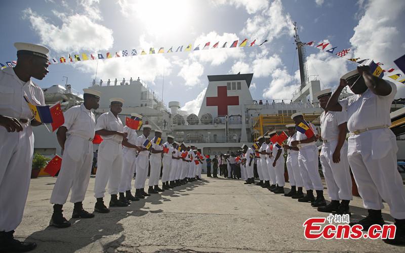 People welcome the arrival of China's naval hospital ship Peace Ark at the port of Bridgetown, Barbados, Nov. 27, 2015. China's naval hospital ship Peace Ark arrives in Bridgetown on Friday for a seven-day medical service and goodwill visit. (CNS photo/Jiang Shan)