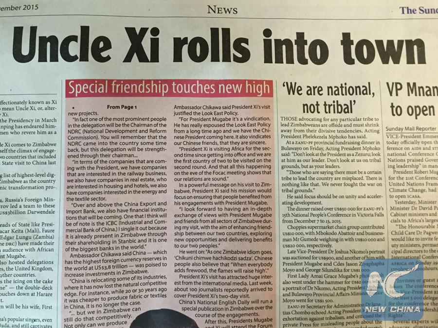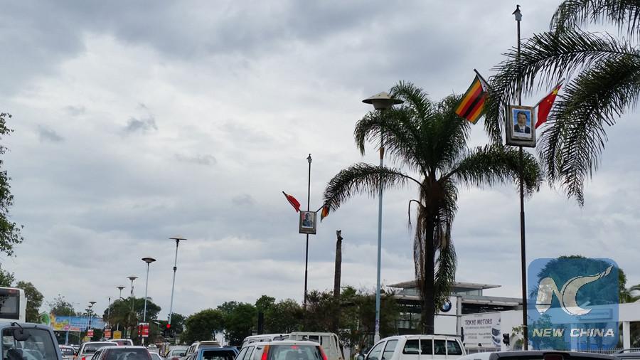 National flags of China and Zimbabwe are displayed on a street of Harare, capital of the African country. (Photo/Xinhua)