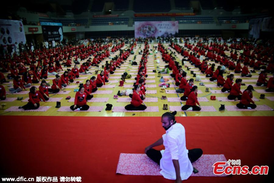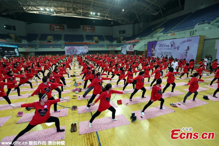 Over 1,000 pregnant women do yoga with guidance of an Indian master to prepare for the birth at a gymnasium in Nantong, East China’s Jiangsu province on November 29, 2015. (Photo/ IC)