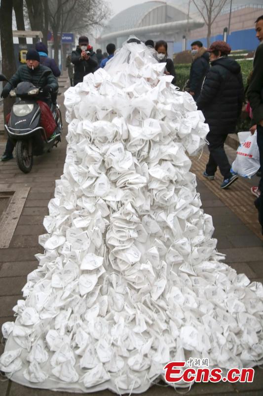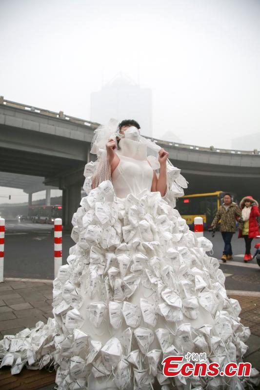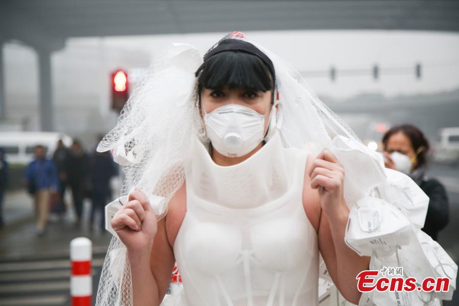 In a wedding dress made with anti-smog masks, a girl stages her performance art show on a street near the Beijing Railway Station in Beijing on Monday, December 1, 2015. The artist named Kong Ning played the role of “smog girl” who married "blue sky" in the show. (Photo/CFP)