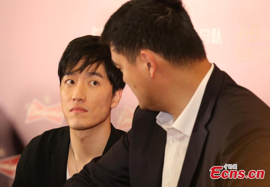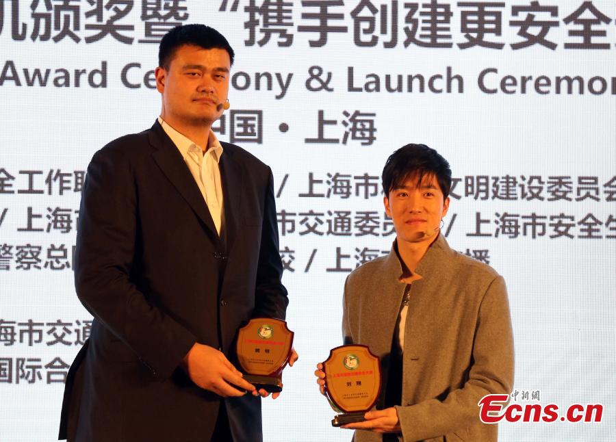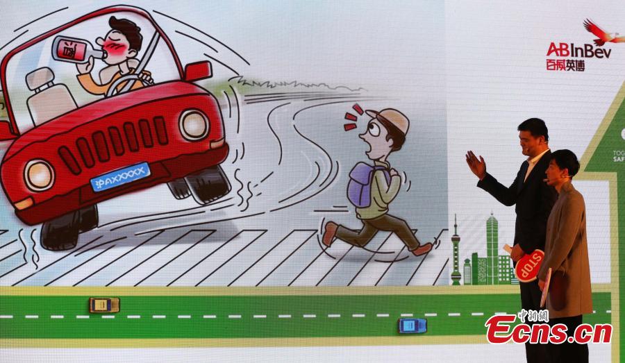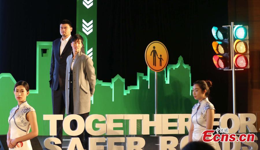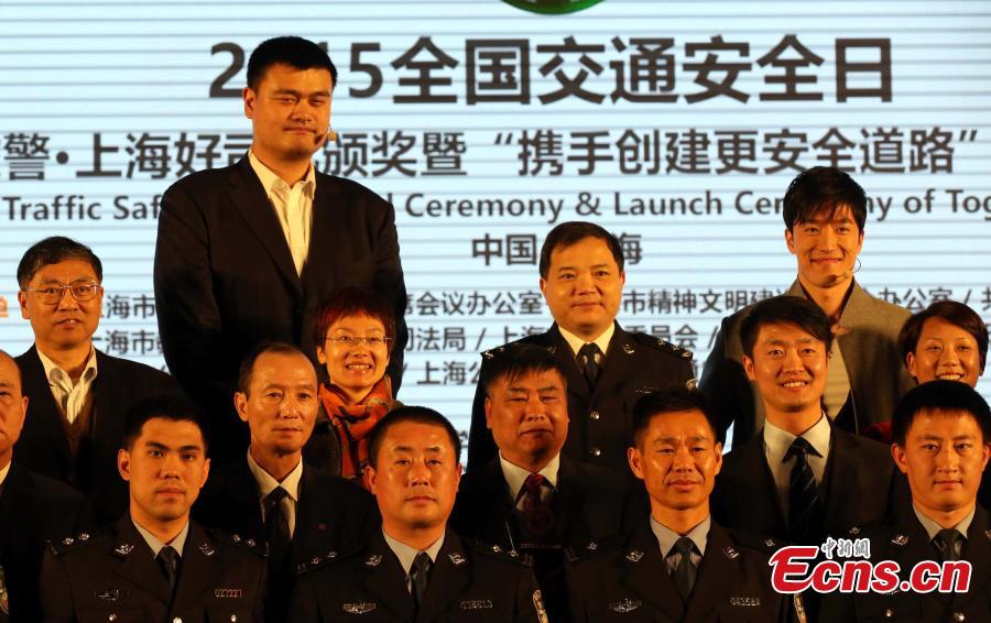 Former NBA player Yao Ming (left, second) and hurdler Liu Xiang (right, second) pose for a photo with traffic police officers and drivers during an event to promote road safety in Shanghai on December 2, 2015. The two sports stars also acted leading roles in a micro film aimed at preventing drunk driving. (Photo: China News Service/ Pan Suofei)