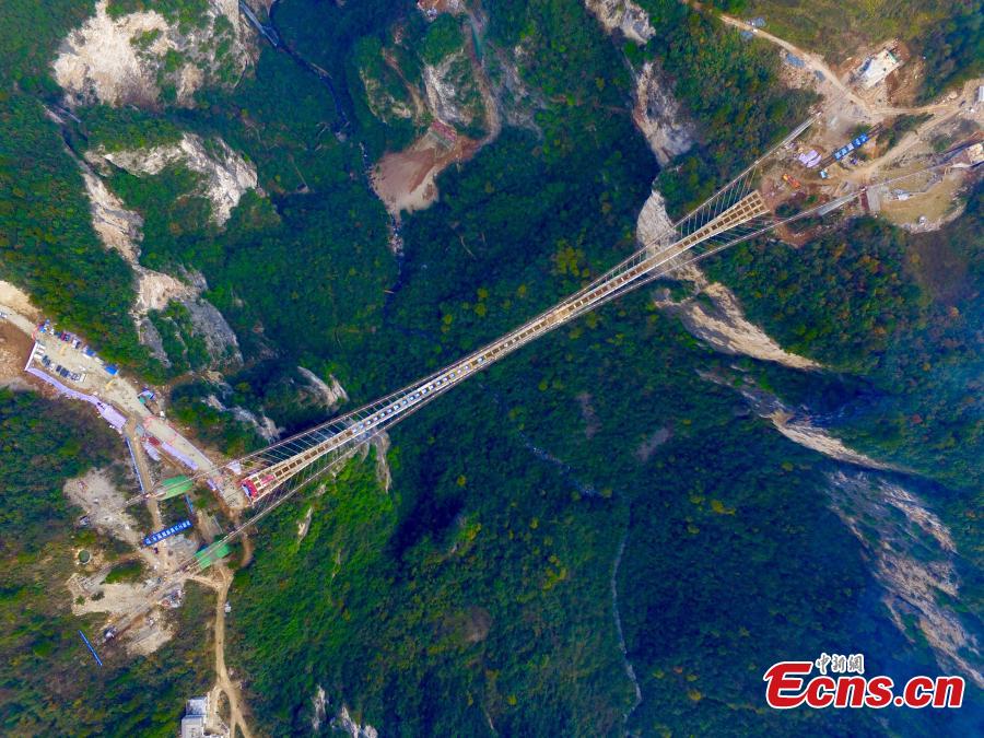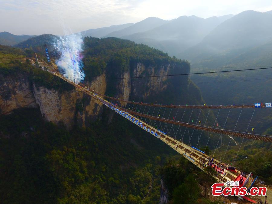 Steel decks of a skywalk glass bridge are joined together in Zhangjiajie, Central China’s Hunan province on Thursday morning, December 3, 2015. Stretching across the Zhuangjiajie Grand Canyon, the glass bridge has set many world records. As a landscape bridge, it is not only a passageway. Tourists can go bungee jumping and ziplining from that bridge. Spanning a total of 430 meters, the bridge is 375 meters long, 6 meters wide and 300 meters above the valley floor. This transparent glass bridge ranks first globally in both length and height. The bridge will be open to public in May 2016. (Photo/CFP)