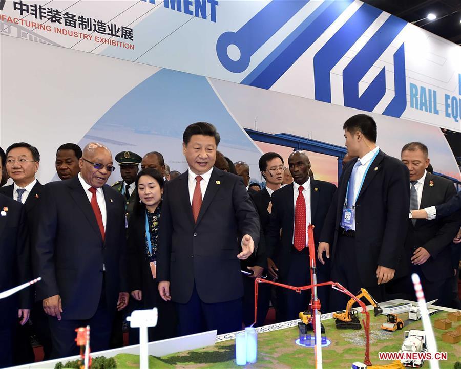 Chinese President Xi Jinping (3rd L, front) and South African President Jacob Zuma (2nd L, front) visit China-Africa equipment manufacturing industry exhibition in Johannesburg, South Africa, Dec. 4, 2015. Xi, Zuma and Zimbabwean President Robert Mugabe attended the opening ceremony of the exhibition here on Friday. (Xinhua/Ma Zhancheng)