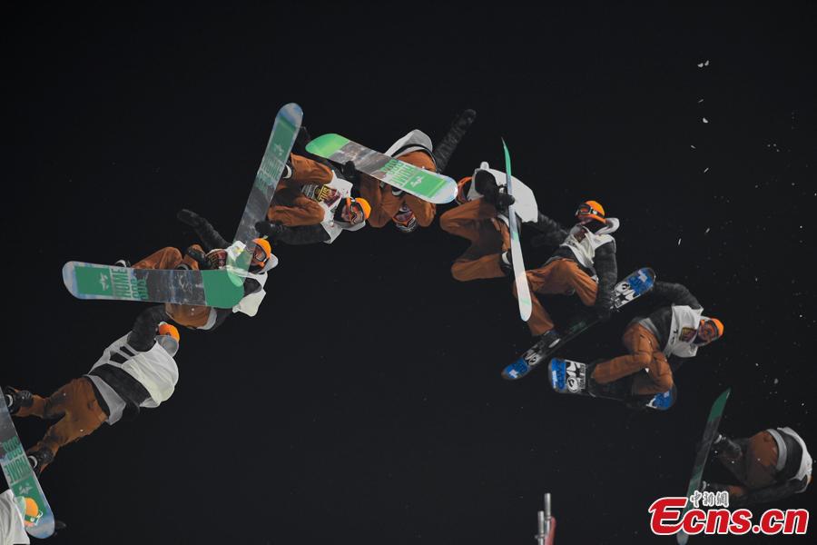 An athlete competes during the 2015 Air & Style Snowboard eventat the Beijing National Stadium, known as Bird's Nest, in Beijing, capital of China, Dec. 5, 2015. (CNS photo/ Liaopan)