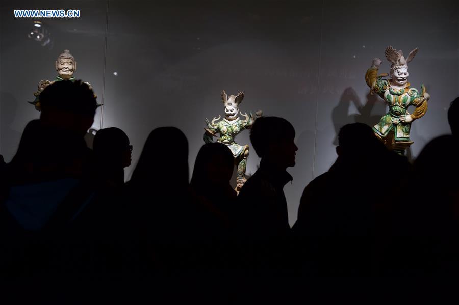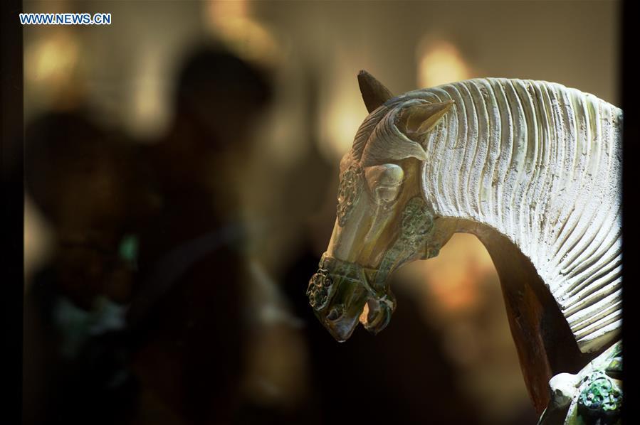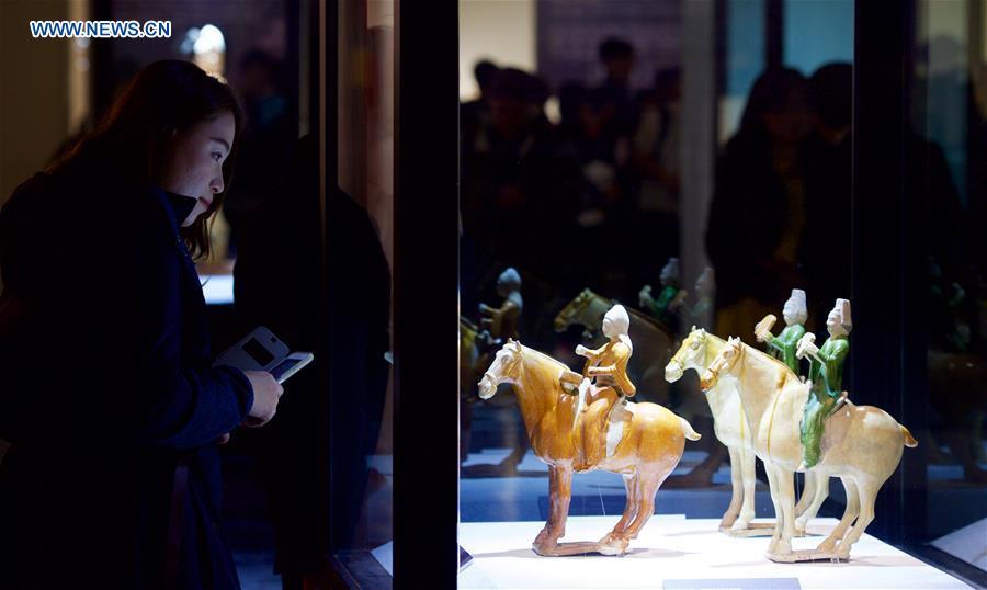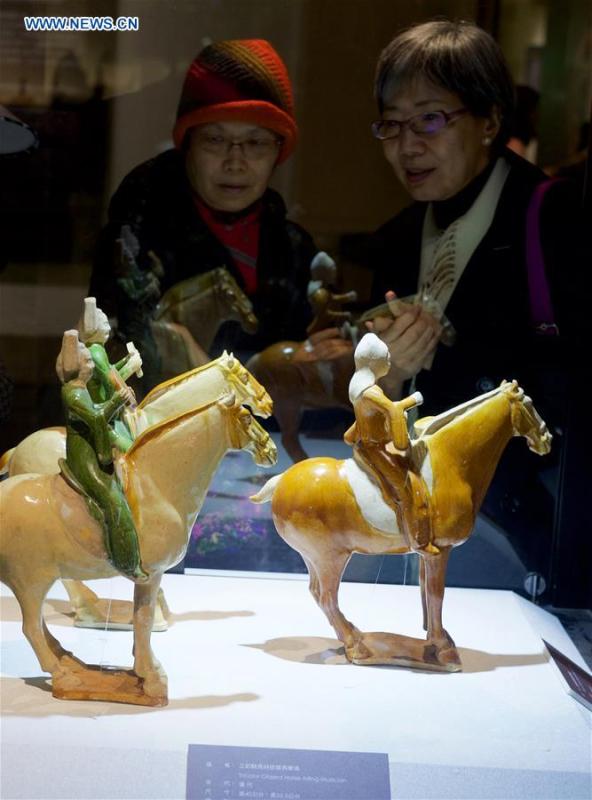 Photo taken on Dec. 4, 2015 shows a tri-color glazed pottery horse during a cross-Strait exhibition on tri-color glazed pottery of Tang Dynasty (618-907) in Taipei, southeast China's Taiwan. The exhibition featured a total of 120 tri-color glazed pottery artworks of Tang Dynasty. (Photo: Xinhua/Jiang Kehong)