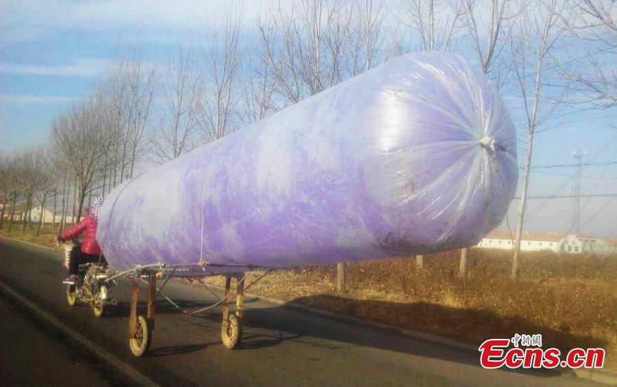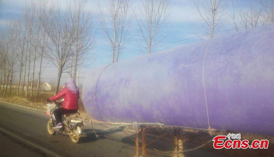 A woman carries a six-meter-long plastic bag filled with natural gas via tricycle on his way back home in Dongying, East China’s Shandong province, December 6, 2015. Some passers-by complained that such way of carrying natural gas posed road safety threat. Dongying is home to the Shengli Oilfield, which is China’s second largest oilfield. (Photo/IC)