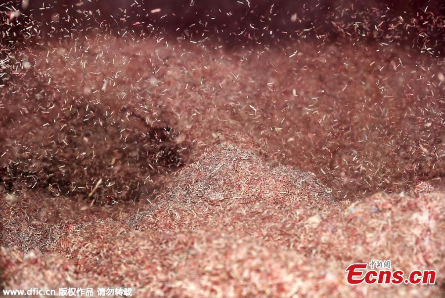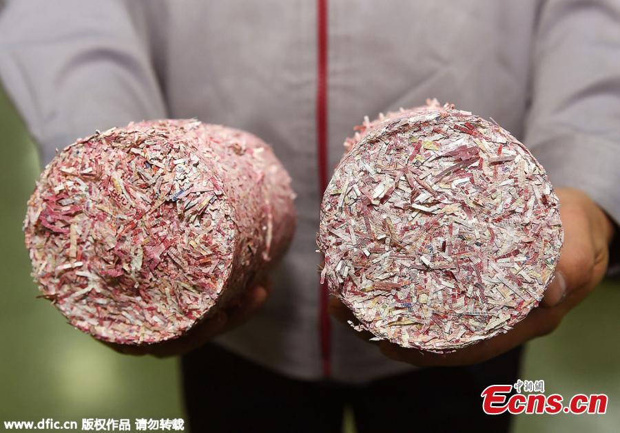 Staff members punch holes on banknotes to be destroyed on Dec. 3, 2015 in the banknote processing center in Chengdu, southwest China's Sichuan province. With the release of a new 100-yuan banknote in 2015, old banknotes will gradually be withdrawn from circulation. At a mysterious place one cannot find on the map of Chengdu, tons of banknotes are destroyed every day. The destroyed banknotes will be transported to paper mills as material for pulp, or burnt for power generation, or used as baking fuels. (Photo/IC)