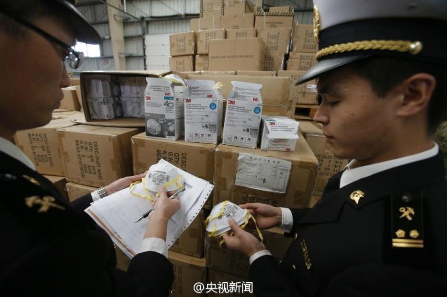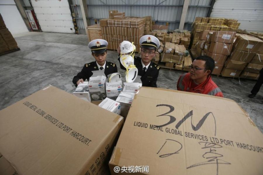 Shanghai Customs officers inspect masks that turned out to be fakes. They seized nearly 120,000 counterfeit masks that carried the “3M” trademark, officers said on December 8, 2015. The crackdown on counterfeits was part of a national campaign that was intended at improving the overseas image of “Made in China” products. Shanghai Customs has investigated 30 such cases involving more than 2.3 million yuan (US$358,308). Most of the masks were bound for the African markets. The seized goods were destroyed after 3M representatives confirmed them as fakes. The company said the products were of poor quality. (Photo/Weibo account of CNTV)