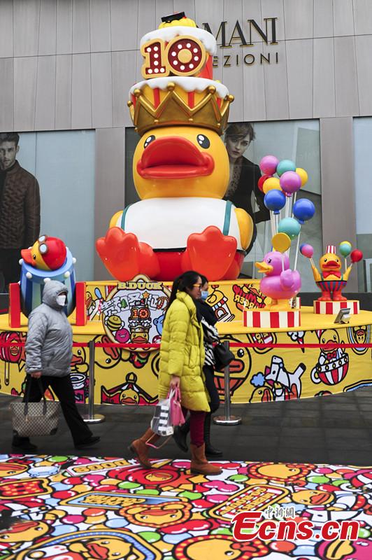 Dec. 10th, Jinan, a Christmas version yellow duck was set outside of a shopping mall in Shandong province. (CNS photo/Zhang Yong)