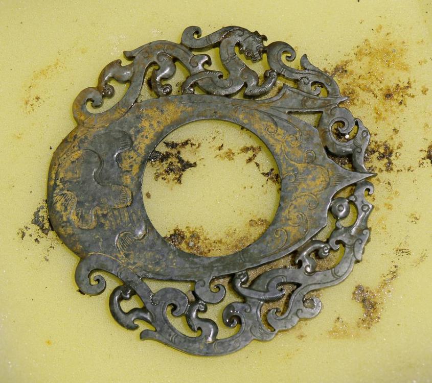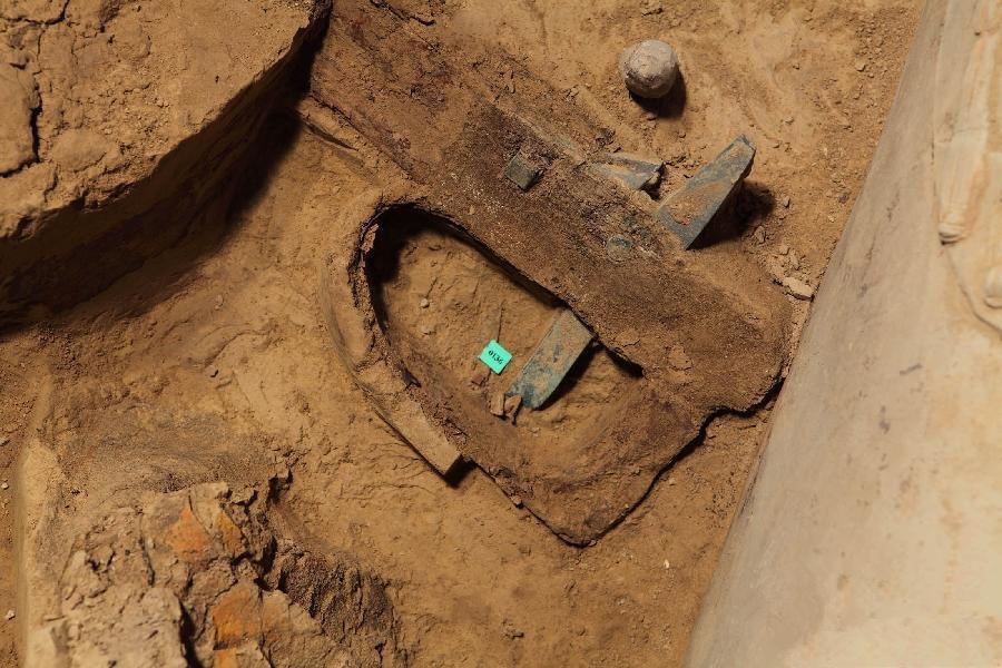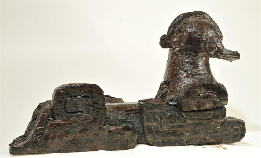 A painted frame of a se with circular carved phoenix head and painted vertical scale patterns on part of the body is excavated in Guojiamiao cemetery. (Photo/kaogu.cn)