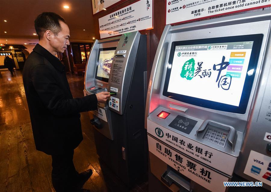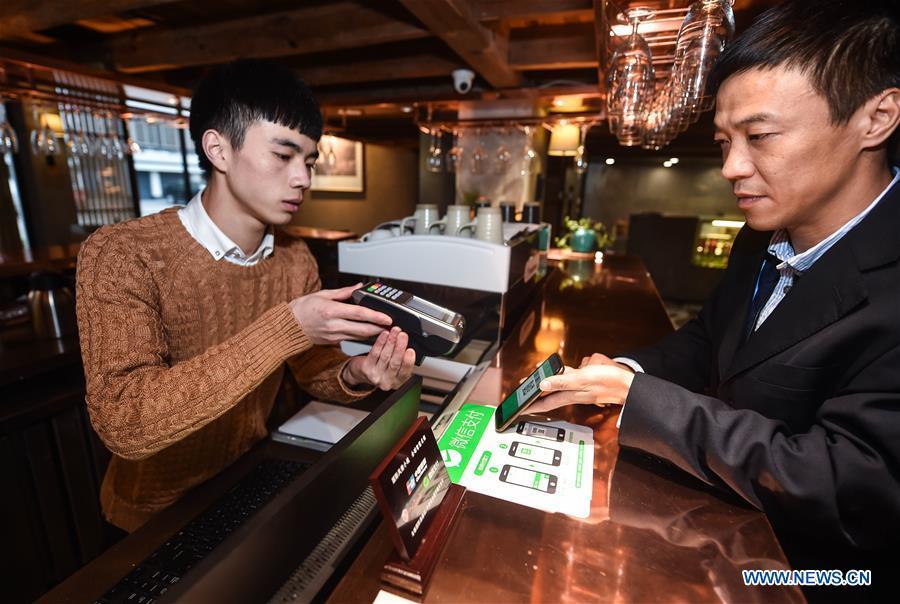A customer uses his mobile phone to pay the bill at a coffee bar in Wuzhen, east China's Zhejiang Province, Dec. 14, 2015. An intelligent payment project was promoted by local government and the Agricultural Bank of China since this July. The project installed multi-functional cashier registers for more than 200 commercial tenants. (Photo: Xinhua/Xu Yu)