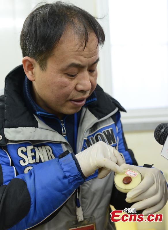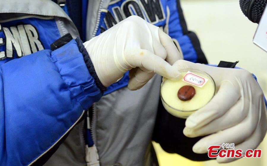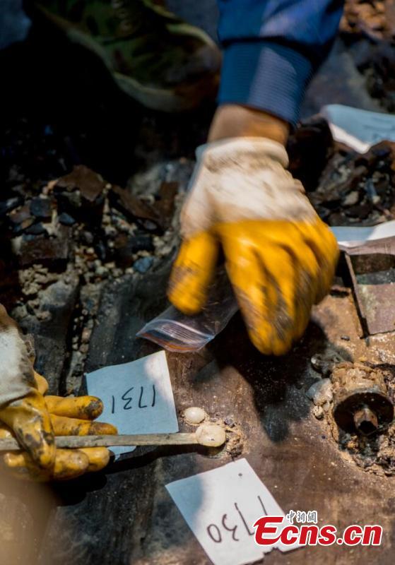 An archeologist shows the amber unearthed from Marquis Haihun's tomb.Rare amber with insects inside has been unearthed at Marquis Haihun's tomb dating back to the ancient China's Western Han Dynasty (206BC-24AD) in Nanchang in Jiangxi province. Archeologists also found remains of lacquer works in the tomb. According to the archeologists, the size of the amber equals a grape. There are aligned shallow holes in two ends of the amber.(Photo: China News Service/Guo Jing)
