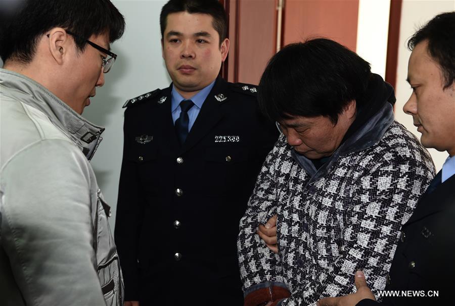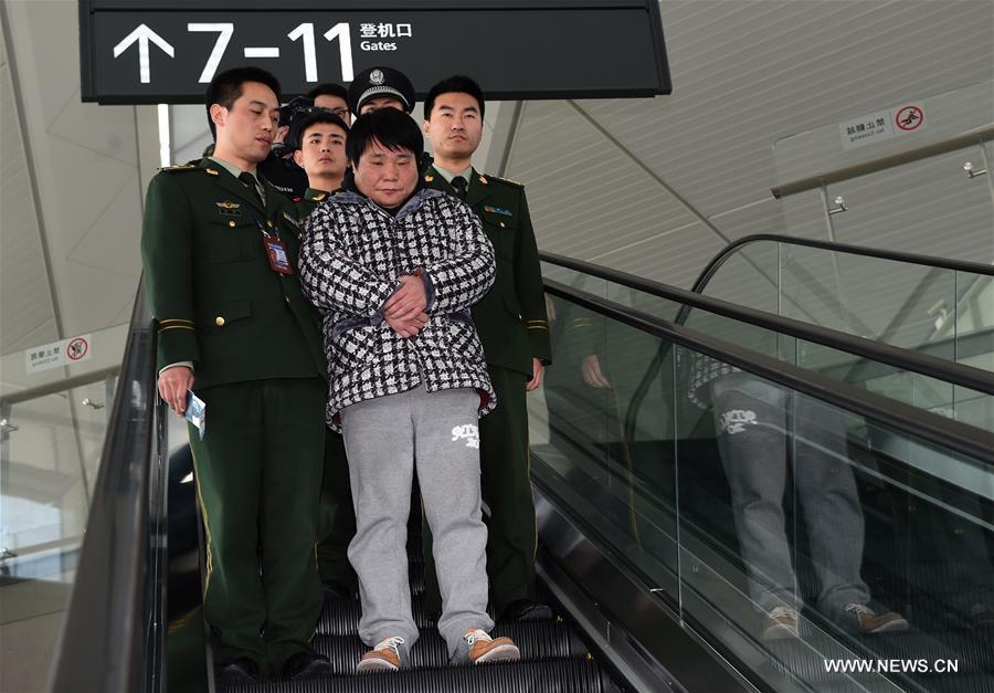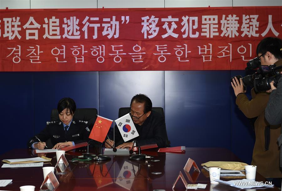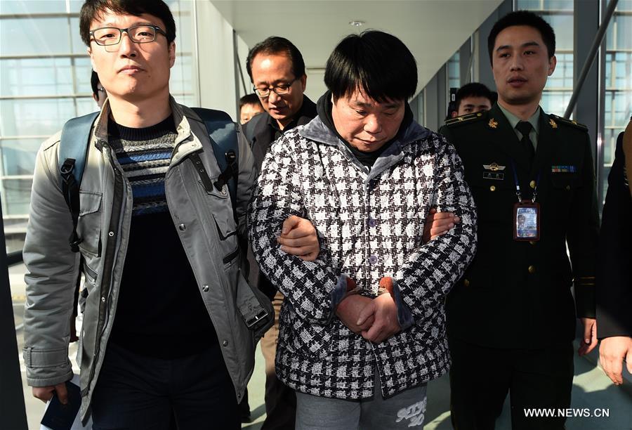 A policeman from the Republic of Korea (L) confirms identity of Kang Taeyong at Lukou international airport in Nanjing, east China's Jiangsu Province, Dec. 16, 2015. Chinese police on Wednesday handed over a Korean fugitive on Interpol's Most Wanted List to their Republic of Korea (ROK) counterparts at Nanjing airport. It is alleged Kang Taeyong, 54, extorted about 1.5 trillion won (about 1.2 billion U.S. dollars) from more than 30,000 people in ROK between 2007 and 2008. Interpol listed him as a most wanted fugitive in November 2008, but they suspect he quickly fled to China. Following approval from the Ministry of Public Security, Jiangsu's Wuxi City Police arrested Kang on Oct. 10. (Photo: Xinhua/Han Yuqing)