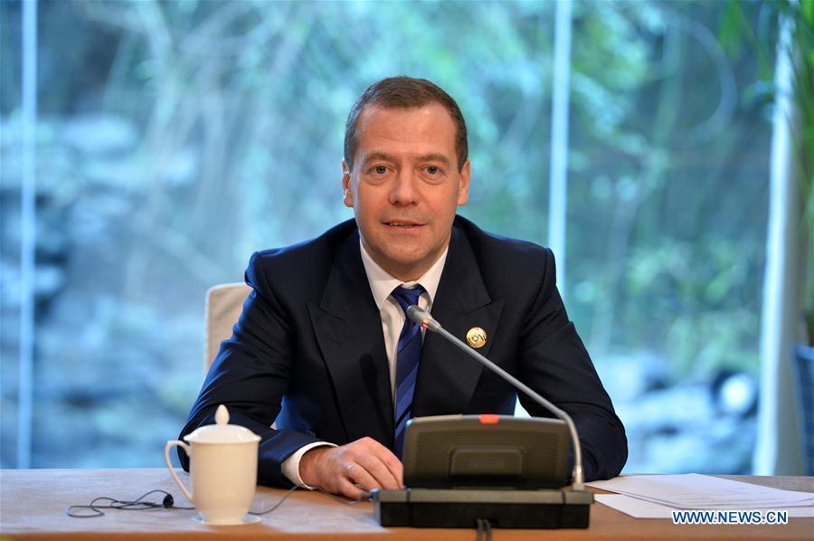 Russian Prime Minister Dmitry Medvedev (C, back) presides over a round-table discussion of Chinese and Russian enterprises in Wuzhen, east China's Zhejiang Province, Dec. 16, 2015. Representatives from Chinese and Russian enterprises, including Alibaba Group, Tencent and Skolkovo, participated in the discussion here on Wednesday. (Photo: Xinhua/Li Xin)