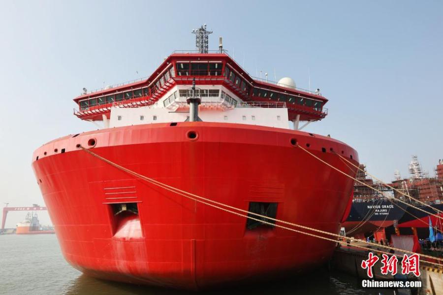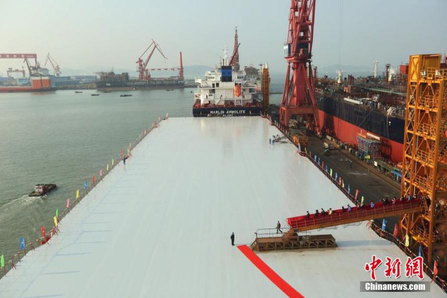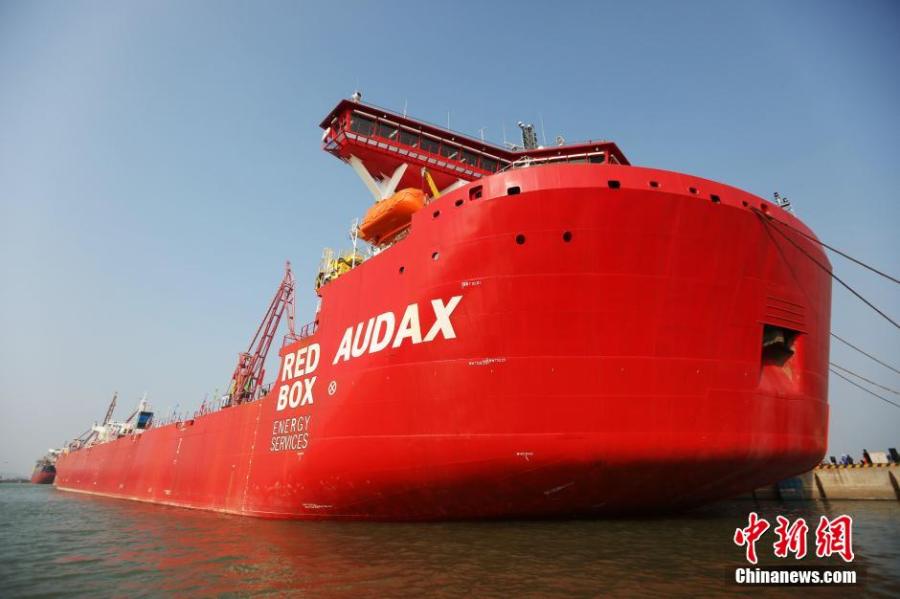 The world's first polar heavy transport vessel is seen as it is named as 'AUDAX' during the naming ceremony at a shipping base in Guangzhou, South China’s Guangdong province on December 15, 2015. The polar transport vessel is more than 200 meters long and 40 meters wide. The Chinese-made vessel will be used to transport massive modules of ocean engineering equipment to polar areas.(Photo/CFP)