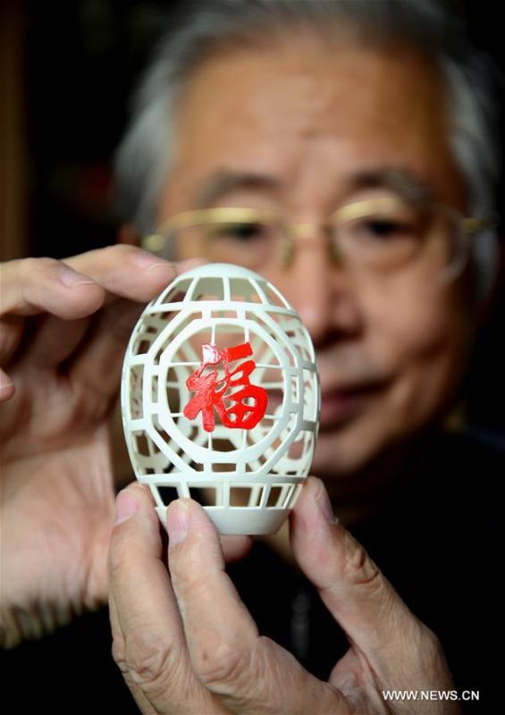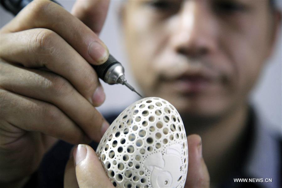 Chef He Ya, born in 1980s, makes egg carvings at home in Bozhou City, east China's Anhui Province, Dec. 16, 2015. Egg carving, a folk craft combining art forms of painting and carving, gets popular in recent years. (Photo/Xinhua)