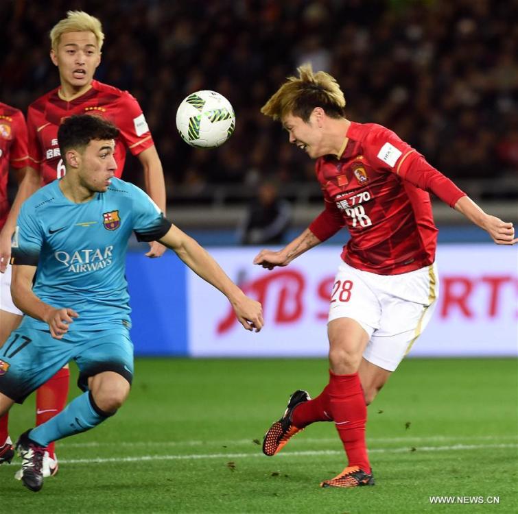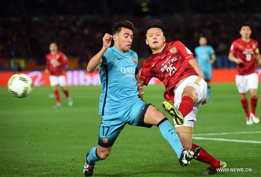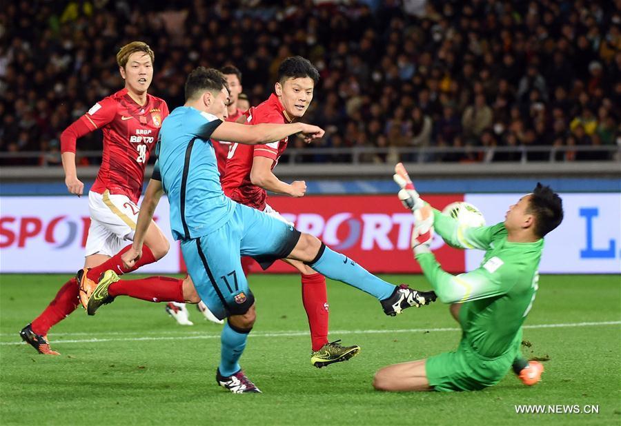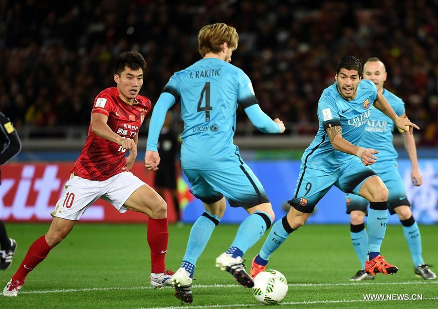 Luis Suarez (2nd R) of Barcelona vies for the ball during the Club World Cup semi-final match against Guangzhou Evergrande in Yokohama, Japan, Dec. 17, 2015. Barcelona won the match 3-0. (Photo: Xinhua/Liu Dawei)