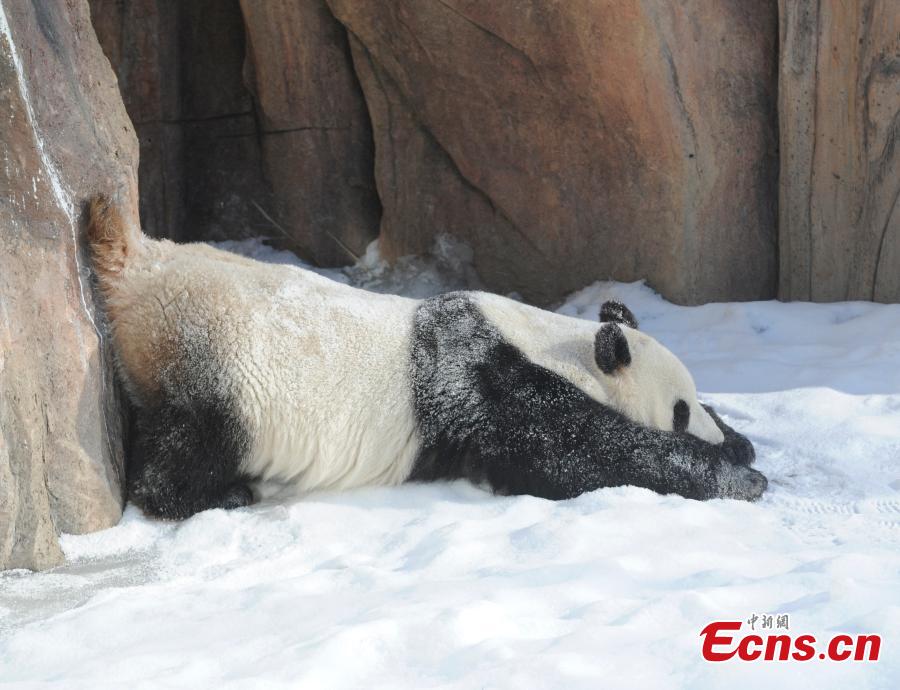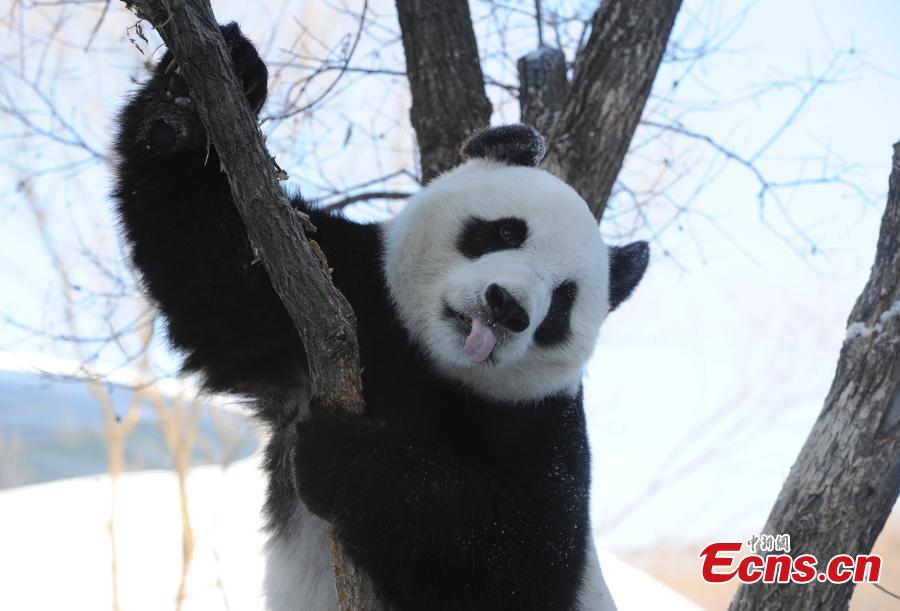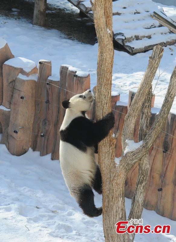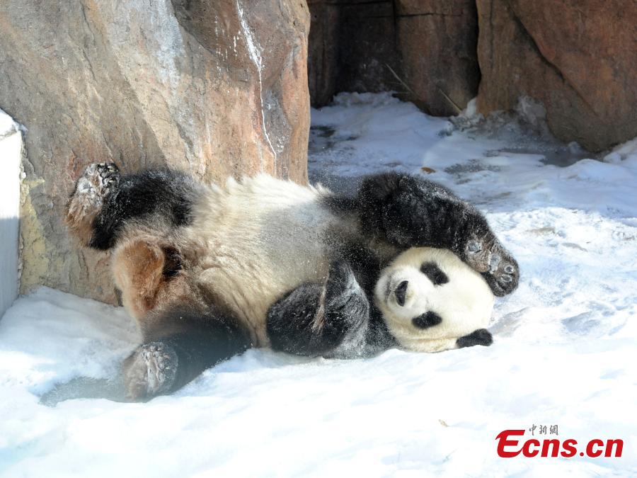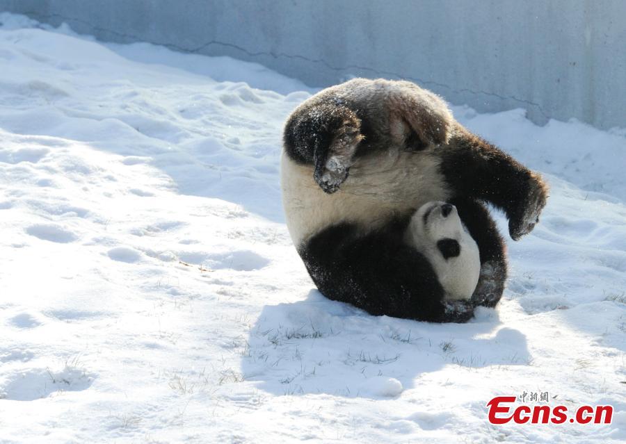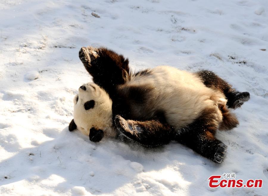 A giant panda plays in snow at the panda house in the Siberian Tiger Park in Changchun, Northeast China’s Jilin Province, Dec. 17, 2015. Jiajia, an 8-year-old male, and Mengmeng, a 7-year-old female, are the first giant pandas to live in a high-altitude habitat in China after they were moved from Sichuan to Changchun. The pandas will spend three years in the city, where researchers will gather data and carry out breeding tests. (Photo: China News Service/Zhang Yao)