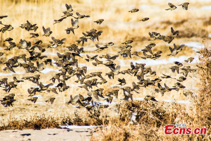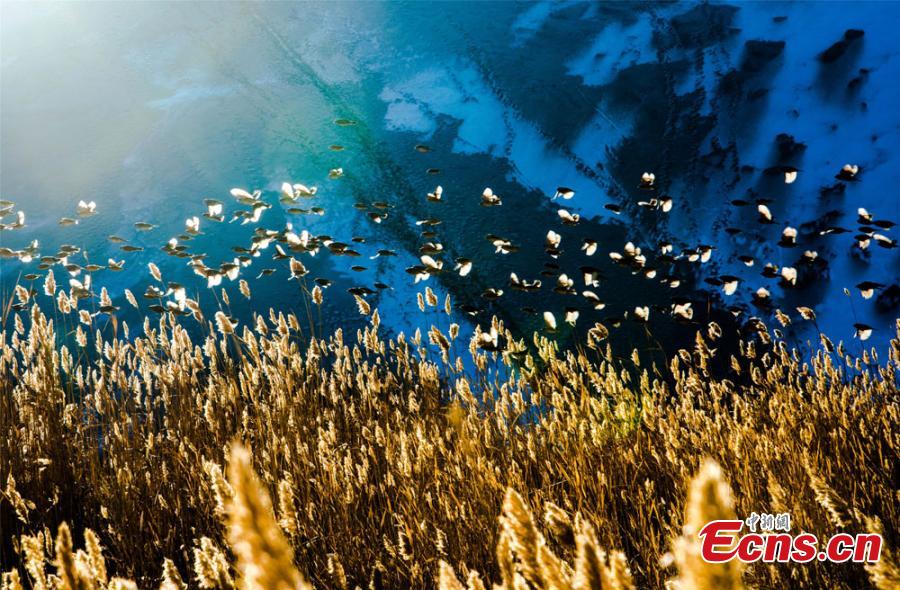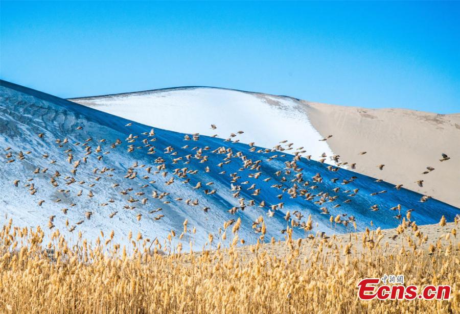 Birds fly at the Mingsha Mountain and Crescent Moon Spring scenic area in Dunhuang city, Northwest China's Gansu Province, Dec. 17, 2015. The city has introduced many measures in recent years to protect the environment near the scenic area and increase its tourism appeal. (Photo: China News Service/Wang Binyin)