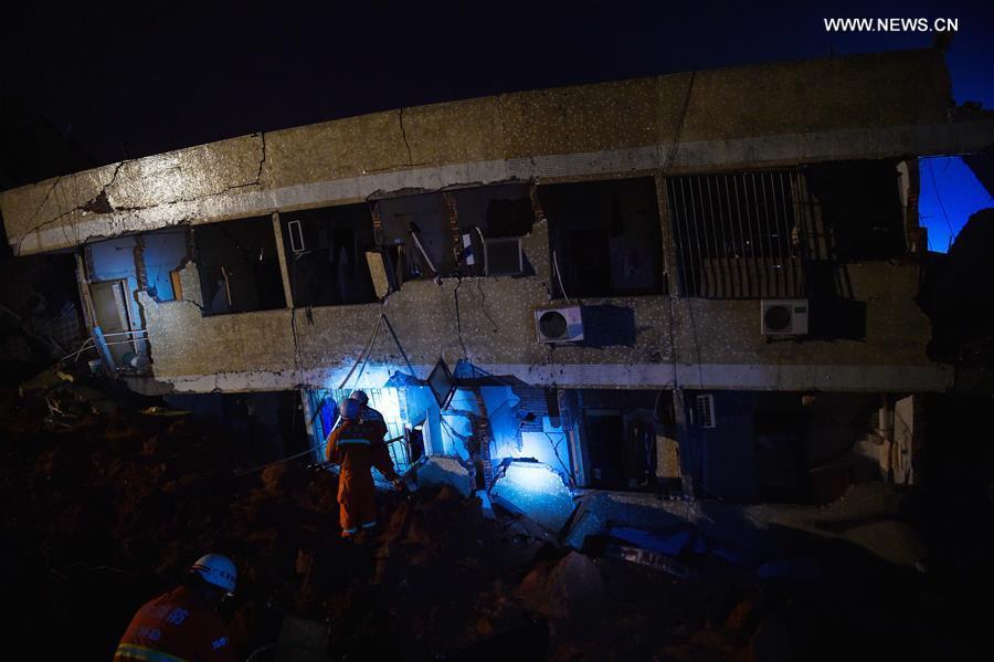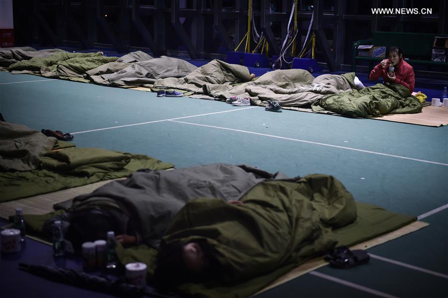 An evacuated boy rests at a makeshift shelter place located at a sports center in Shenzhen, south China's Guangdong Province, Dec. 21, 2015. A total of 59 people went missing by 11 p.m., after a landslide buried 33 buildings in an industrial park in Shenzhen city of south China's Guangdong Province on Sunday, according to local authorities. Around 900 people has been evacuated as of 5 p.m. Sunday. (Xinhua/ Mao Siqian)