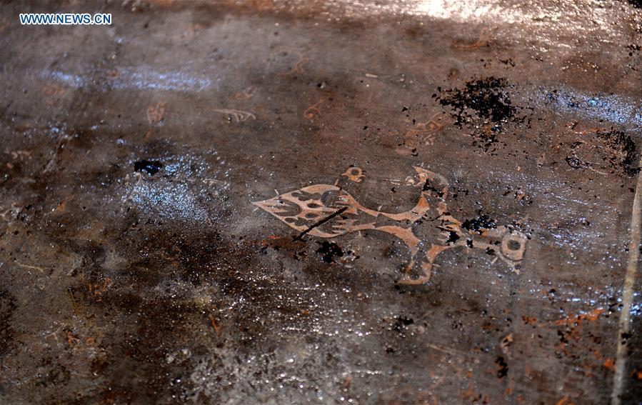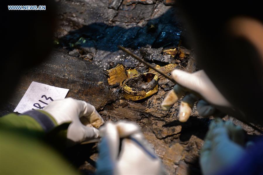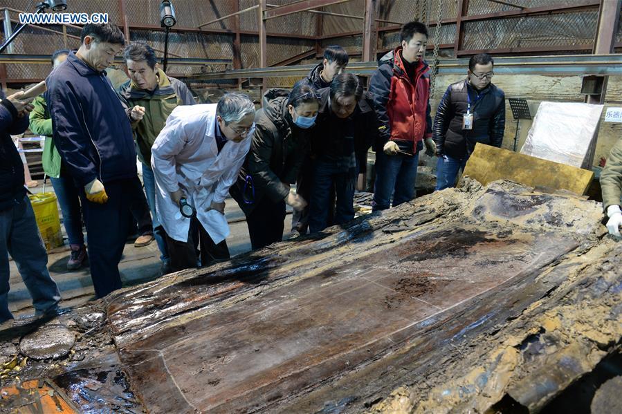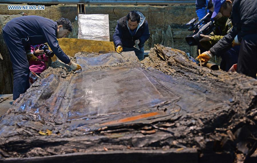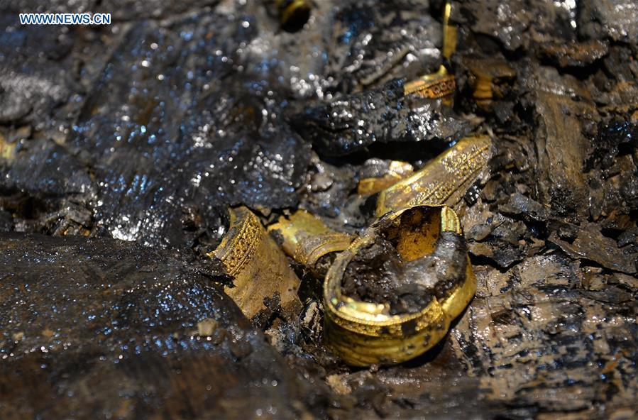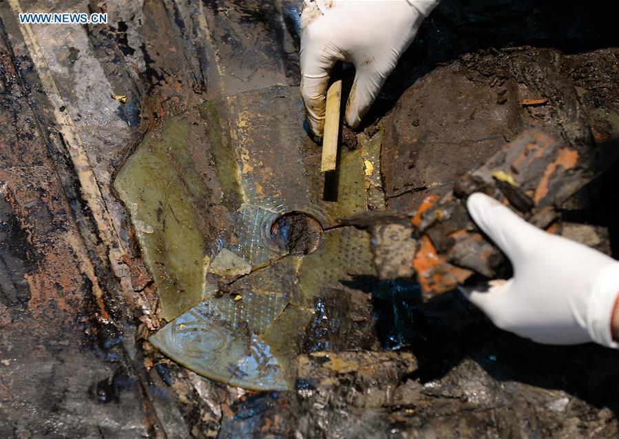 Photo taken on Dec. 20, 2015 shows gilded trunks unearthed from the main coffin in the Haihunhou (Marquis of Haihun) cemetery, east China's Jiangxi Province. The outer lid of the main coffin in the Haihunhou cemetery was opened on Sunday. According to archaeologists working at the site, relics inside the main coffin in the 2,000-year-old tomb of Haihunhou will likely reveal the occupant's identity. The Haihunhou cemetery near Nanchang City, capital of east China's Jiangxi Province, is the most complete known Western Han Dynasty (206 BC - 24 AD) cemetery. (Xinhua/Wan Xiang)
