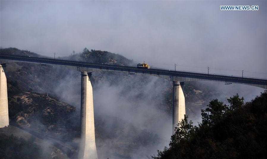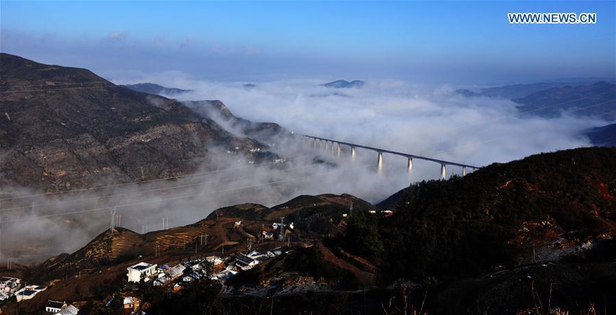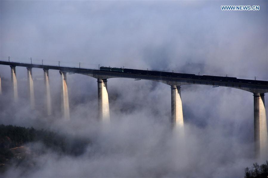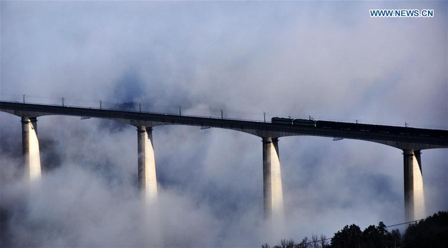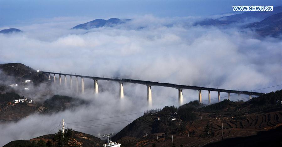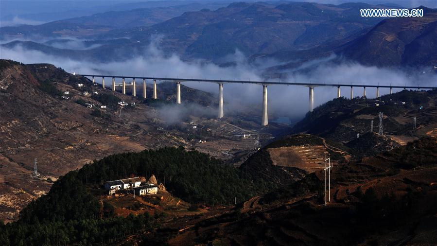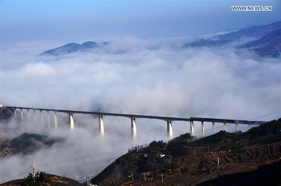 A train runs on the Lizigou Grand Bridge in Guanfenghai Township of Weining County in Bijie City, southwest China's Guizhou Province, Dec. 20, 2015. The Lizigou Grand Bridge, which measures 1,032 meters long with three main spans, is one of two massive structures on the Neijiang-Kunming Railway line. (Xinhua/Yang Wenbin)