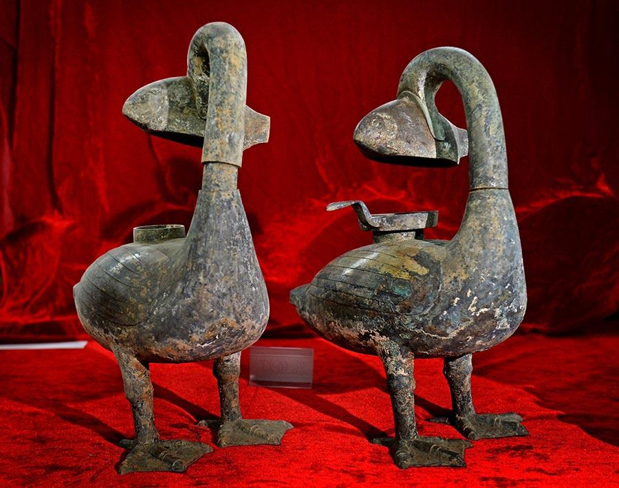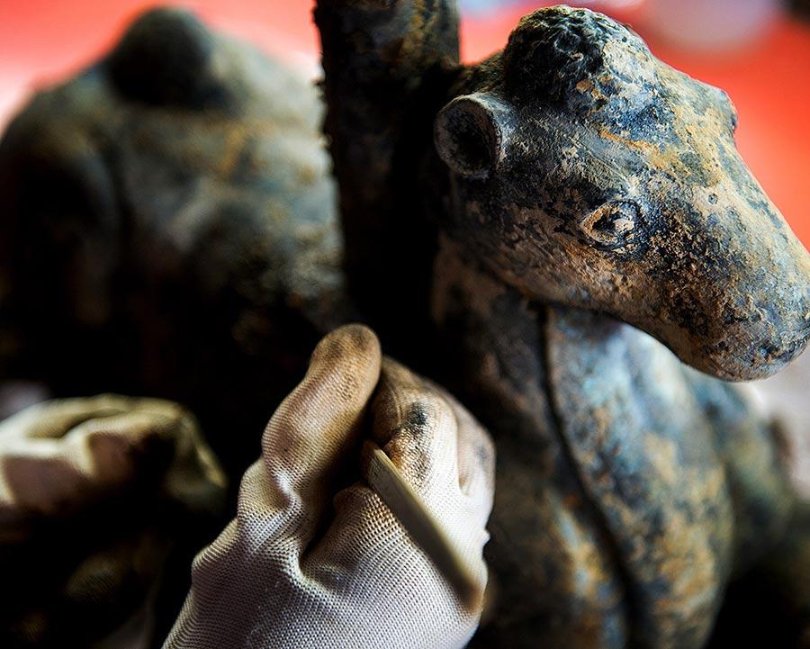 Two archaeologists clean a bronze vessel unearthed from the excavation site of royal tombs of the Western Han Dynasty (206 BC-AD 24) in Nanchang, Jiangxi province. (Photo by Guo Jing/China Daily)