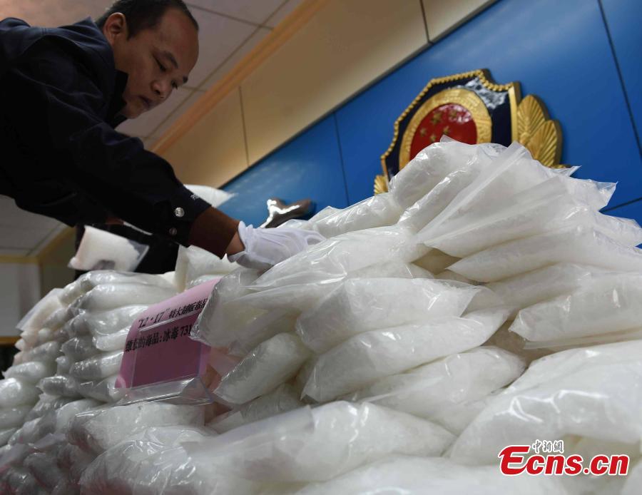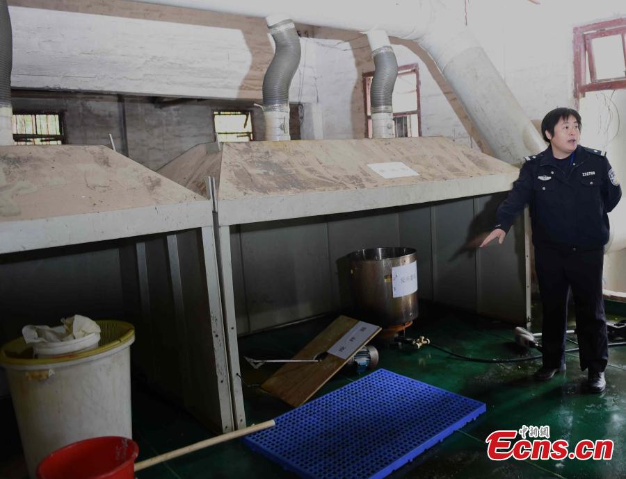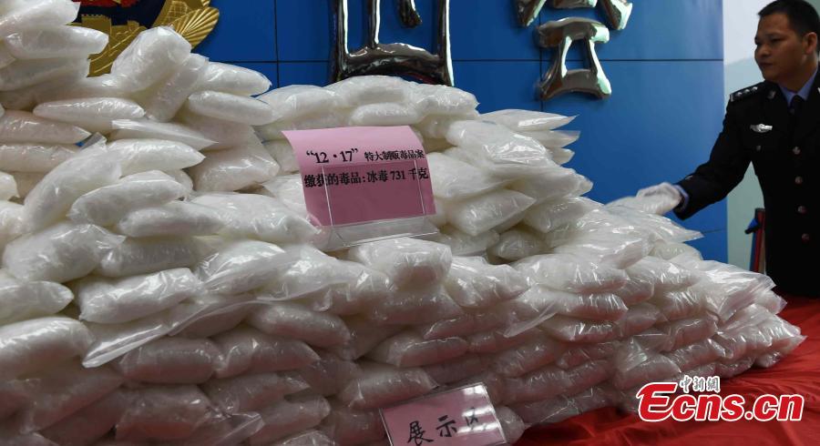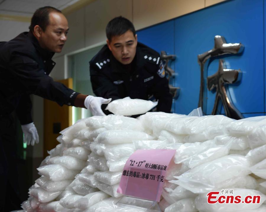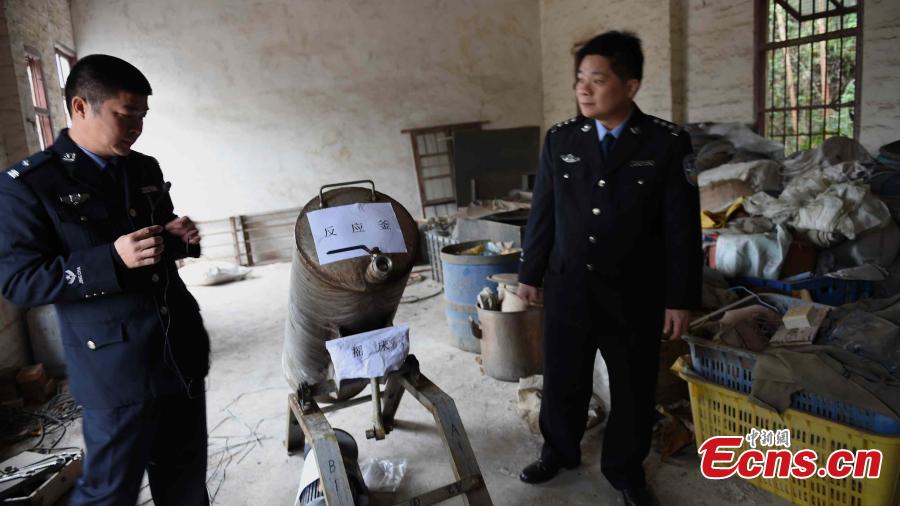Police introduce raw materials and equipment used by drug-making suspects in Zhaoqing, South China’s Guangdong Province, Dec. 21, 2015. Local police also seized 731 kilograms of crystal methamphetamine and arrested eight suspects. (Photo: China News Service/Huang Yaohui)