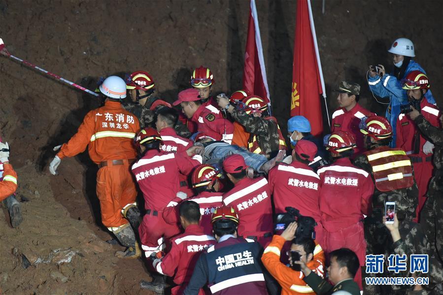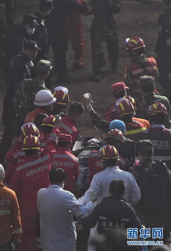 One man was pulled out alive early Wednesday morning more than 60 hours after a landslide in the southern city of Shenzhen, south China's Guangdong Province, Dec. 23, 2015. Survivor was conscious, but his leg injured. (Photo/Xinhua)
