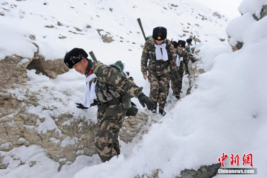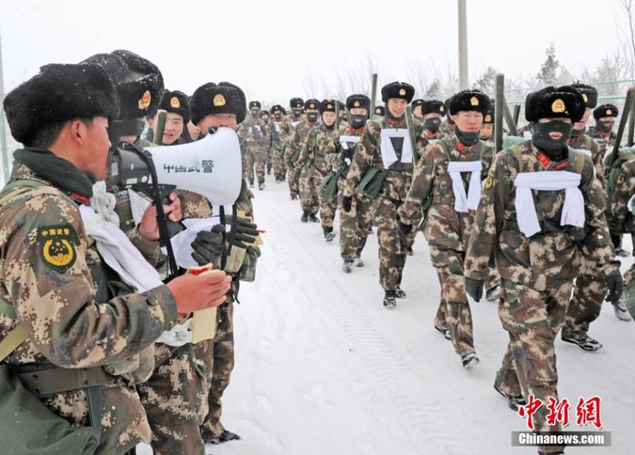 New soldiers brave wind and cold in training on a snow-covered mountain in Bayingolin Mongol Autonomous Prefecture, Northwest China’s Xinjiang Uygur Autonomous Region in mid-December 2015. Hundreds of fresh recruits, carrying heavy backpacks, took the intensive training to finish a rough journey of 260 kilometers in seven days, while the temperatures dropped to minus 20 degrees Celsius. (Photo: China News Service/Wei Yinhe)