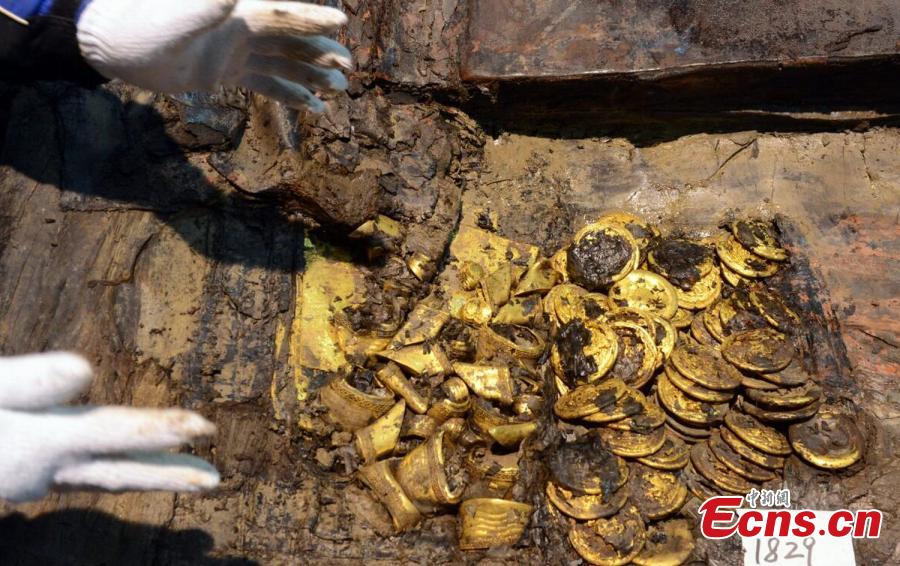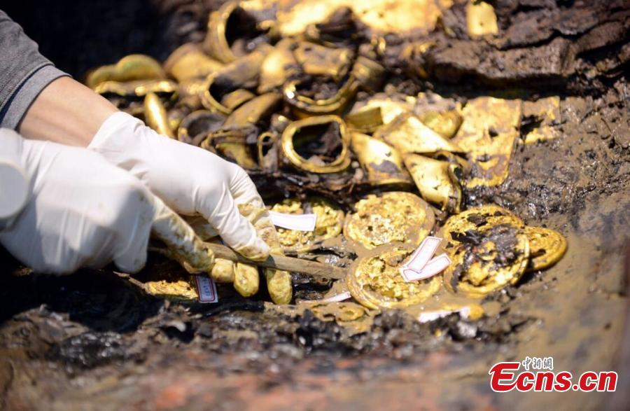 Photo taken on Dec 24, 2015 shows hoof-shaped and round gold ware unearthed from the outer coffin in the Haihunhou (Marquis of Haihun) cemetery, East China's Jiangxi province. Chinese archaeologists have found more than 20,000 pieces of relics from a 2,000-year-old tomb, which they believe belong to a marquis of the Western Han Dynasty (206 BC - 24 AD). Now they have entered the final and key phrase. (Photo: China News Service/Guo Jing)