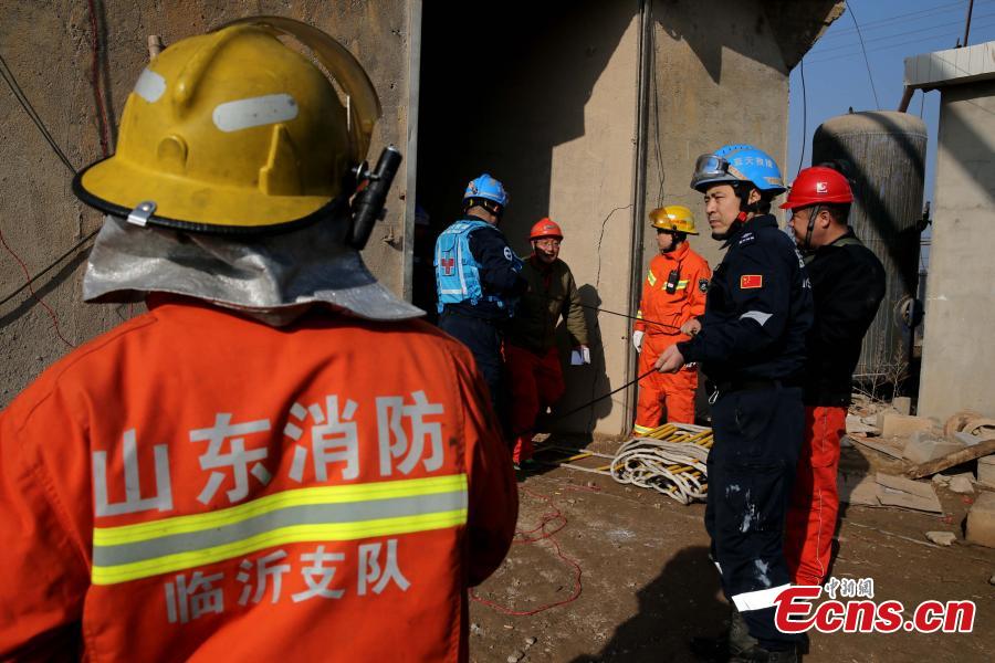 Firefighters are seen at a gypsum mine in Pingyi County, east China's Shandong Province, Dec. 26, 2015. Eleven of the 29 people trapped on Friday in the collapsed gypsum mine have been rescued by Saturday morning, rescuers said. A total of 29 people were working underground when the collapse occurred at about 8 a.m. Friday. Ten of them were rescued on the same day. Rescuers have located the 18 miners who are trapped at two different sites. (CNS photo/ Liangben)