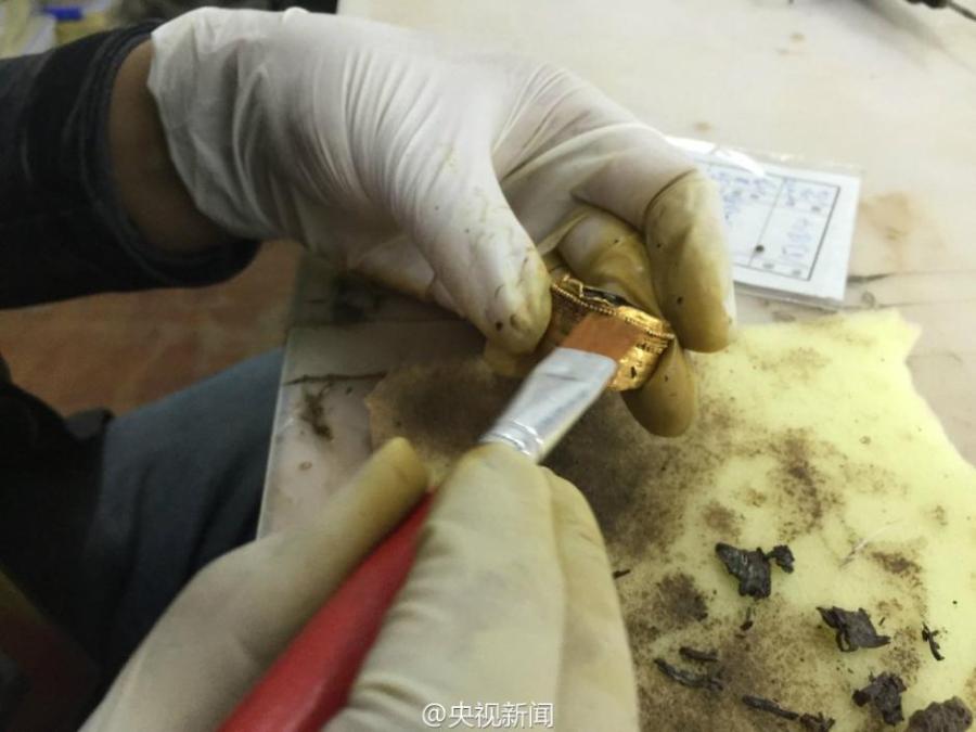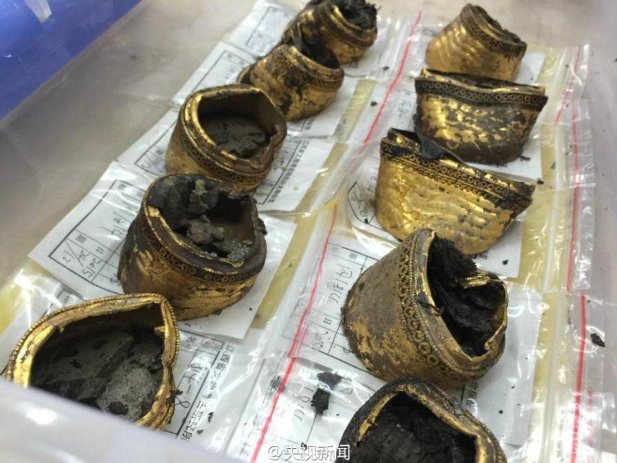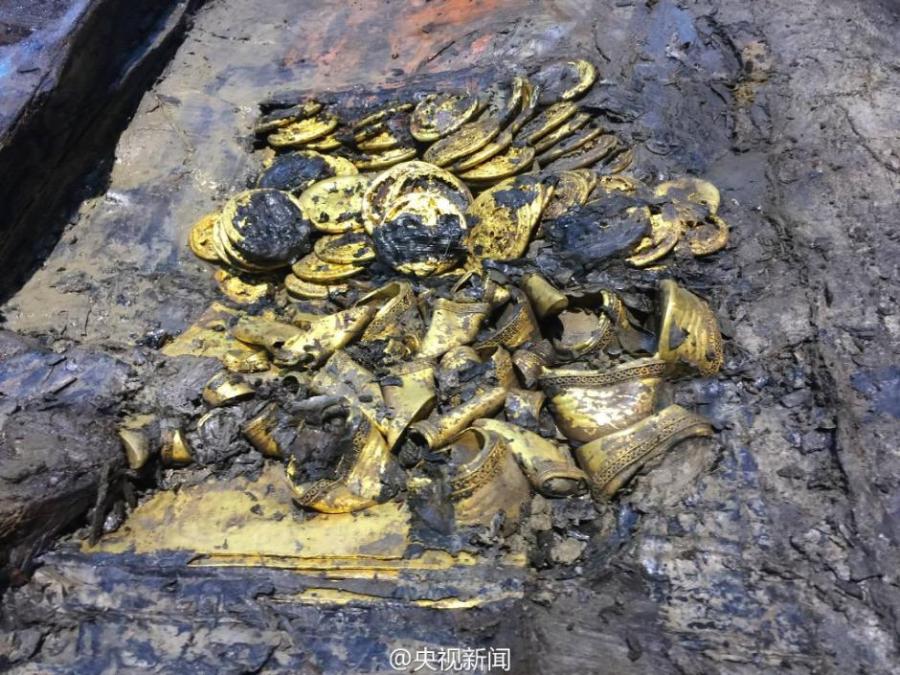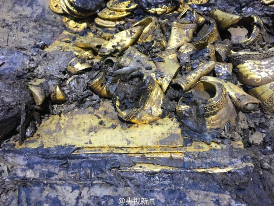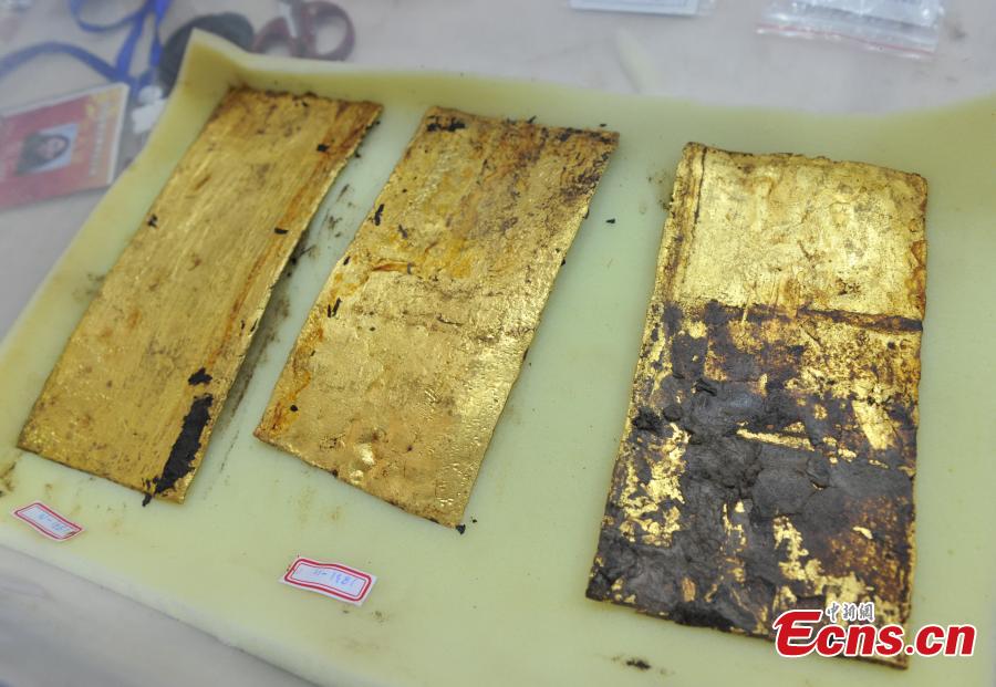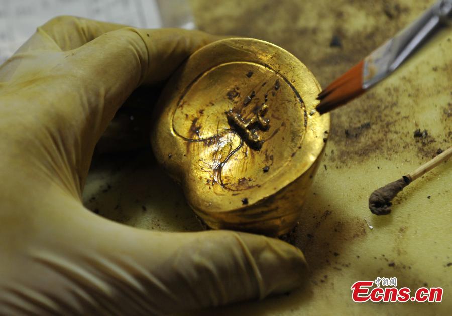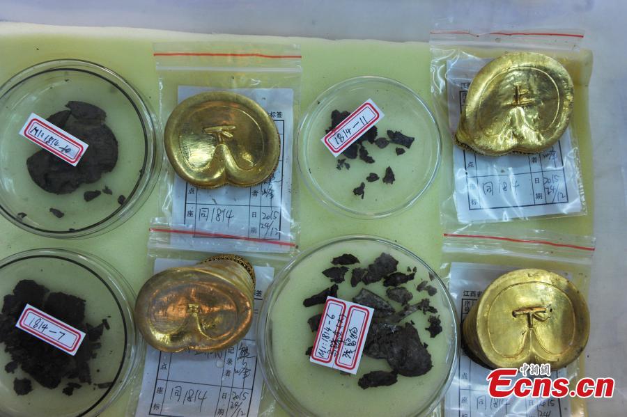 Photo taken on Dec. 27, 2015 shows hoof-shaped gold ingots unearthed from the tomb of "Haihunhou" (Marquis of Haihun) in Nanchang, the capital of East China's Jiangxi Province. Chinese characters shang(up), zhong(middle) and xia(down) are engraved on the gold ingots. Gold plates were also found in the tomb which dates back to Western Han Dynasty (206 BC - 24 AD). Each of the gold plates is 23 centimeters long, 10 centimeters wide and 0.3 centimeters thick. The tomb is thought to belong to Liu He, grandson of Emperor Wu. Liu was given the title "Haihunhou" after he was deposed as emperor after only 27 days. Haihun is the ancient name of a very small kingdom in the north of Jiangxi. (Photo/IC)
