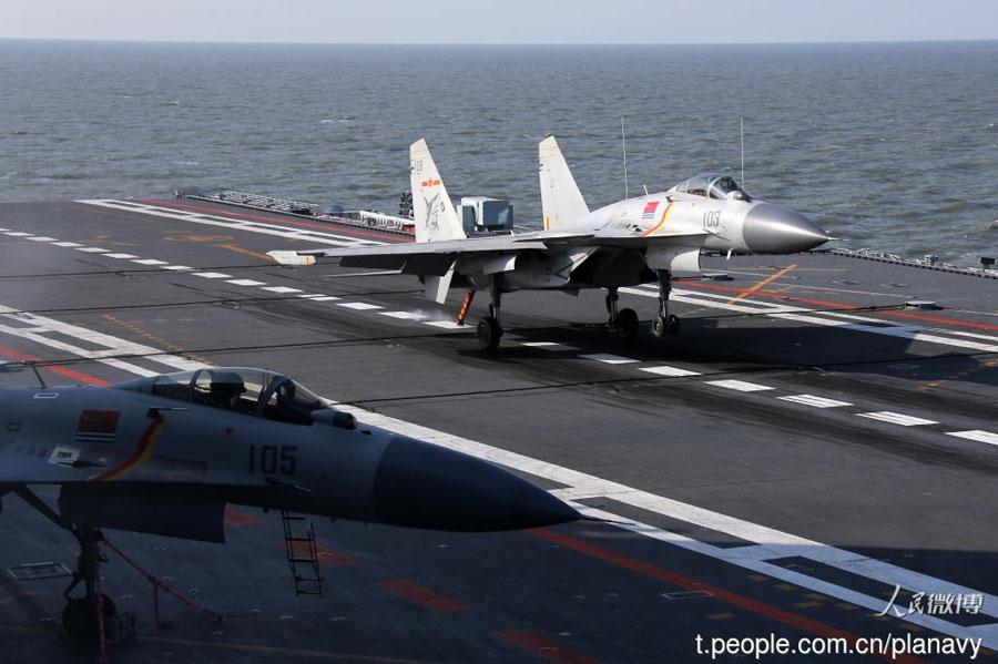 The J-15 carrier-based fighters conduct training on Chinese aircraft carrier Liaoning in the water of Bohai Sea on Dec. 25, 2015. According to Yin Zhuo, a military expert, the Liaoning will be capable of combat soon. (Photo/Weibo of People's Daily Online)