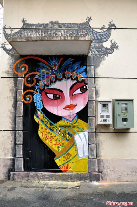 Artists' creative wall graffiti and paintings are seen in a housing area in the Yangpu District, Shanghai, on Dec. 24, 2015. This gives the old areas an entirely new look. (Photo: China.com.cn/Zhou Dongchao)