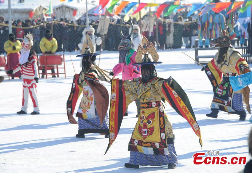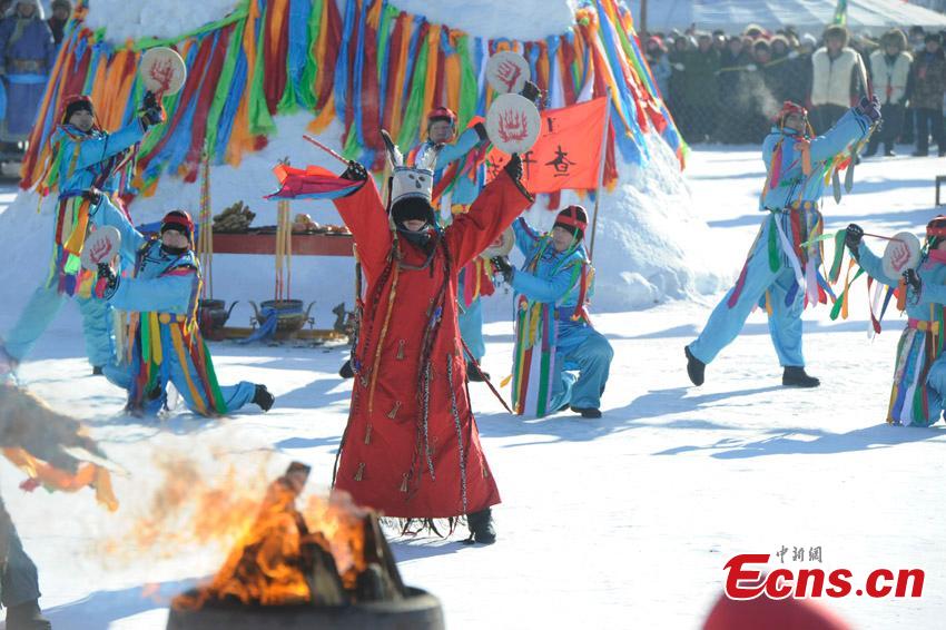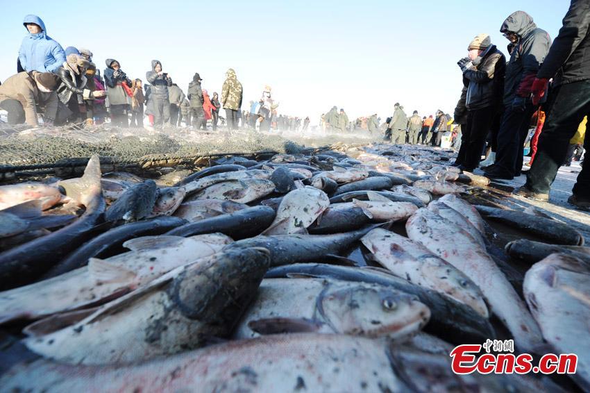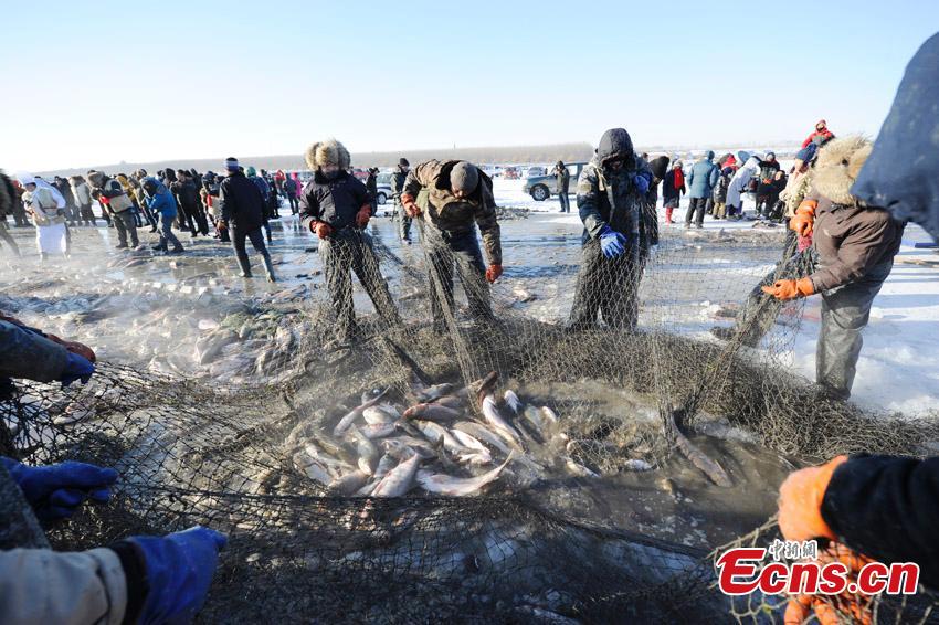Fishermen prepare fishing net on the frozen Chagan Lake in Songyuan City, Northeast China's Jilin Province, Dec. 27, 2015. The annual fishing tourism fair kicked off Monday. A fish caught from the first net was sold at 788,888 yuan ($121,640). (Photo: China News Service/Zhang Yao)
