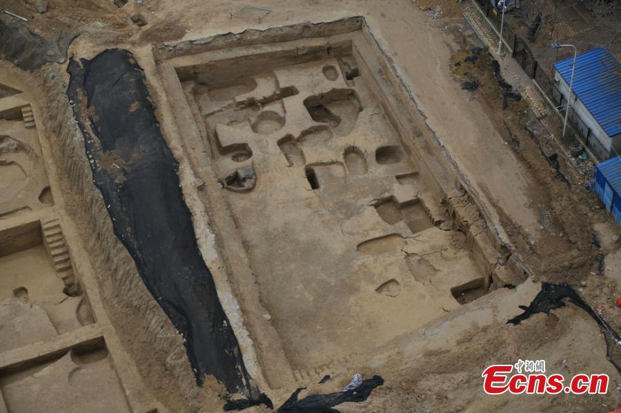 A view of the archeological site near the Henan Provincial Stadium in downtown Zhengzhou City, the capital of Central China’s Henan Province, Dec. 27, 2015. Zhengzhou Administration of Cultural Heritage said animal bones and bone artifacts were found from the tombs belonging to the Shang Dynasty (1600 BC-1046 BC). (Photo/IC)