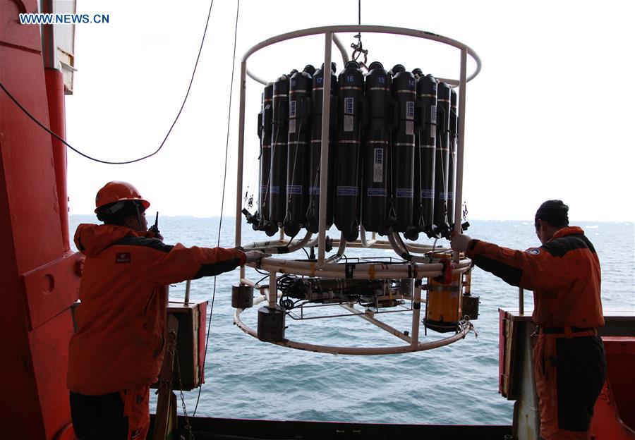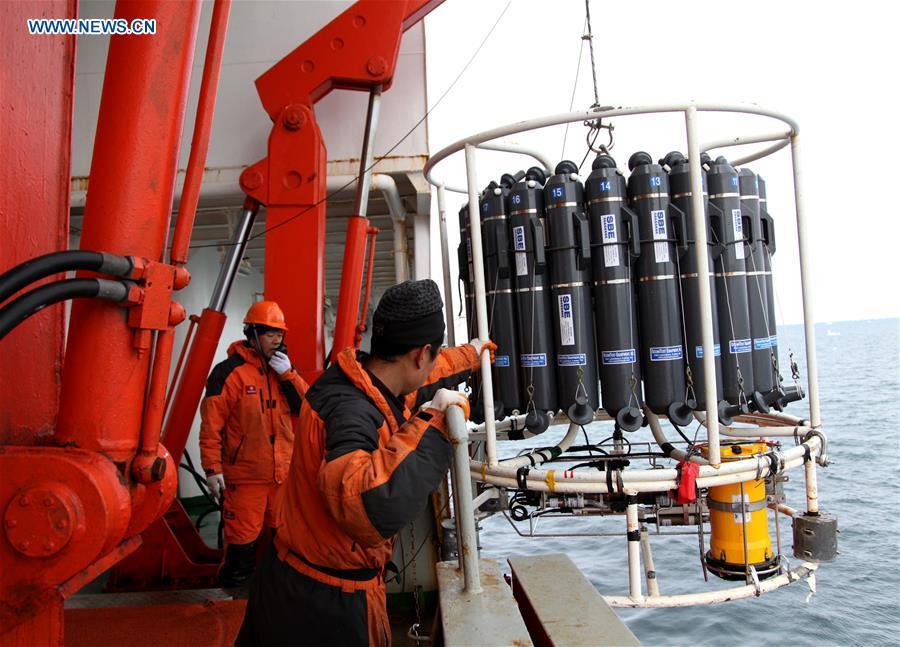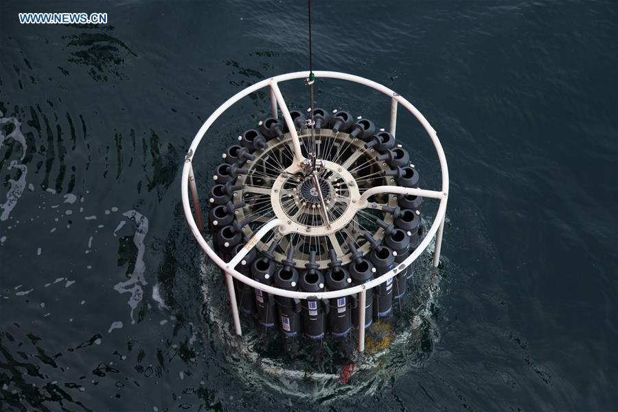 A CTD rosette is lowered into water to measure the salinity, temperature, depth and concentration of particles from China's icebreaker Xuelong (Snow Dragon) in Antarctica, Dec. 29, 2015. China's 32nd Antarctic expedition team started its most expansive marine environmental assessment in waters around the Antarctic Peninsula on Tuesday. (Photo: Xinhua/Zhu Jichai)