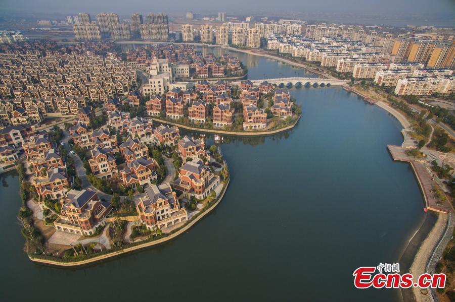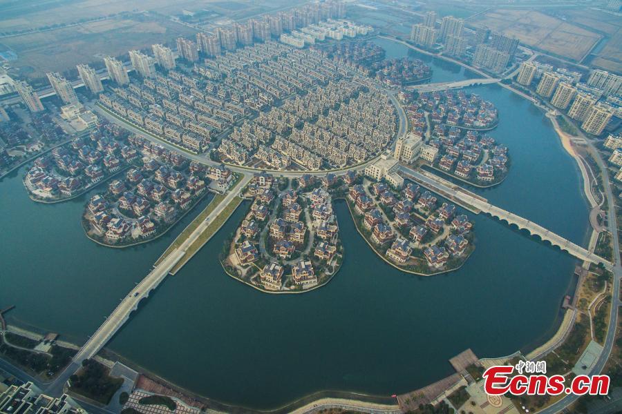 A view of the Jiebei New Village in Danyang City, east China's Jiangsu Province, Dec. 30, 2015. The village, covering an area of 100 hectares, started construction in 2006 and had a total investment of 3.75 billion yuan ($580 million). The village for thousands of households also includes a lake of 21 hectares to wind through the residential buildings, community centers, bridges and pavilions, earning the name of “Oriental Venice”. (Photo/IC)