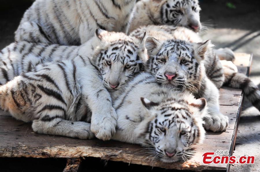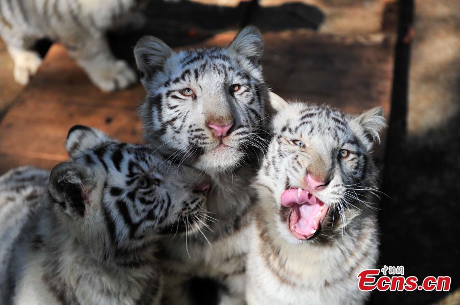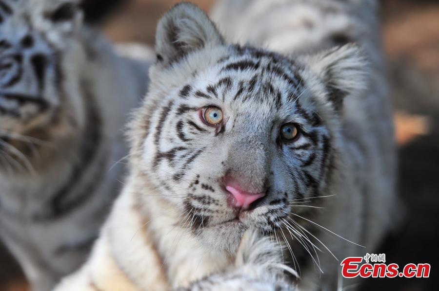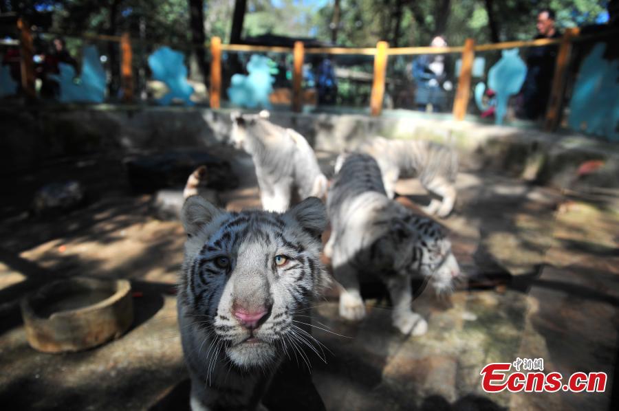 White tiger cubs play at the Wild Animal Park in Kunming, Southwest China's Yunnan Province, Jan. 3, 2016. A White Bengal tiger gave birth to quintuplets at the park in last October. White tigers usually give birth to two or three cubs. Quintuplets are considered very rare. White tiger possesses a gene which gives it the distinctive colouring, according to Tigers.org.za. (Photo: China News Service/Liu Ranyang)