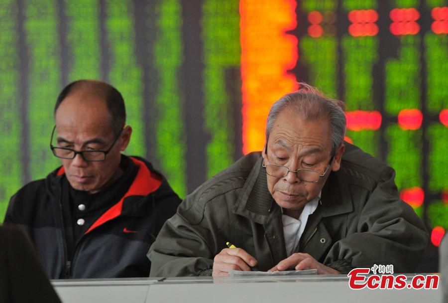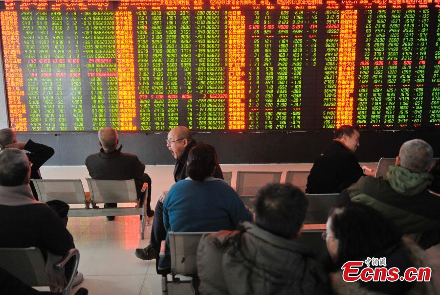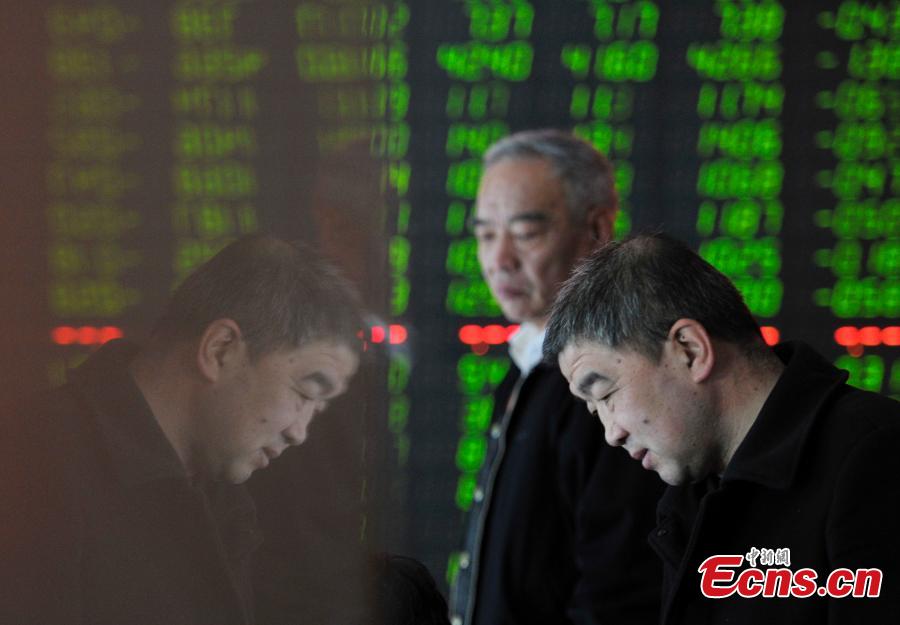 Investors look at an electronic board showing stock information at a brokerage house in Taiyuan, north China’s Shanxi Province, Jan. 4, 2016. Trading on the first day of the year closed earlier than expected, as a 7 percent slump triggered circuit breaker mechanism to halt the market. (Photo: China News Service/Wei Liang)