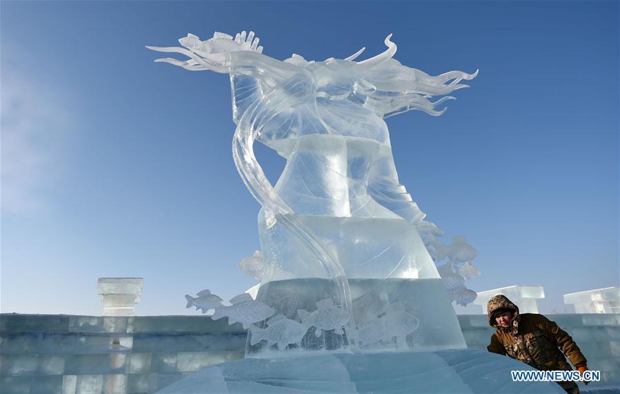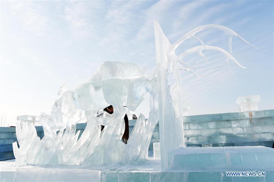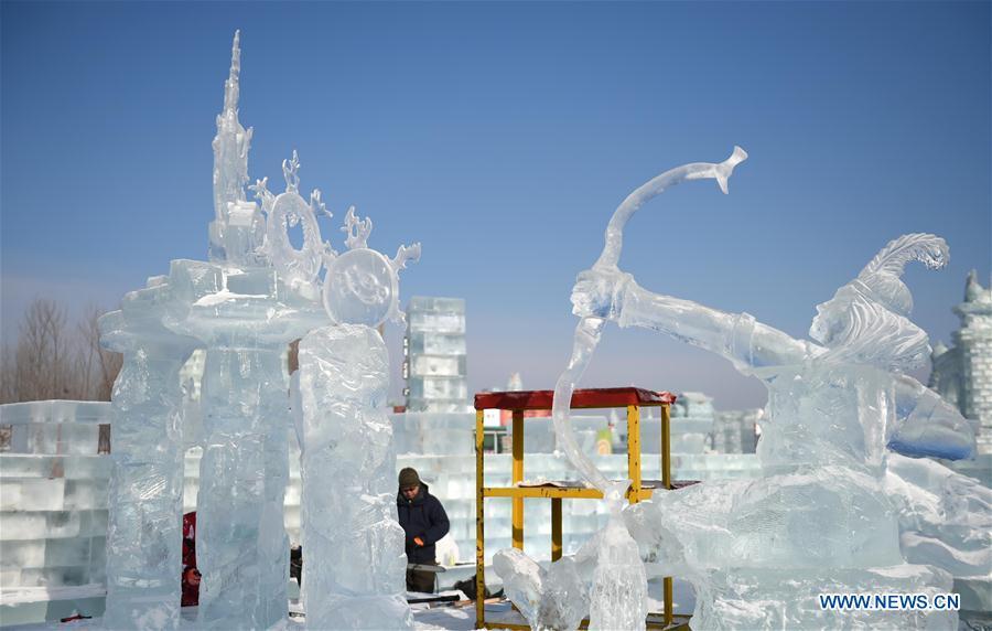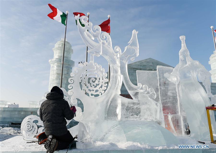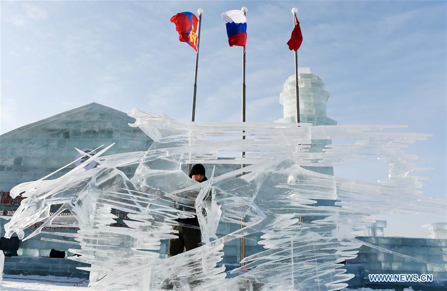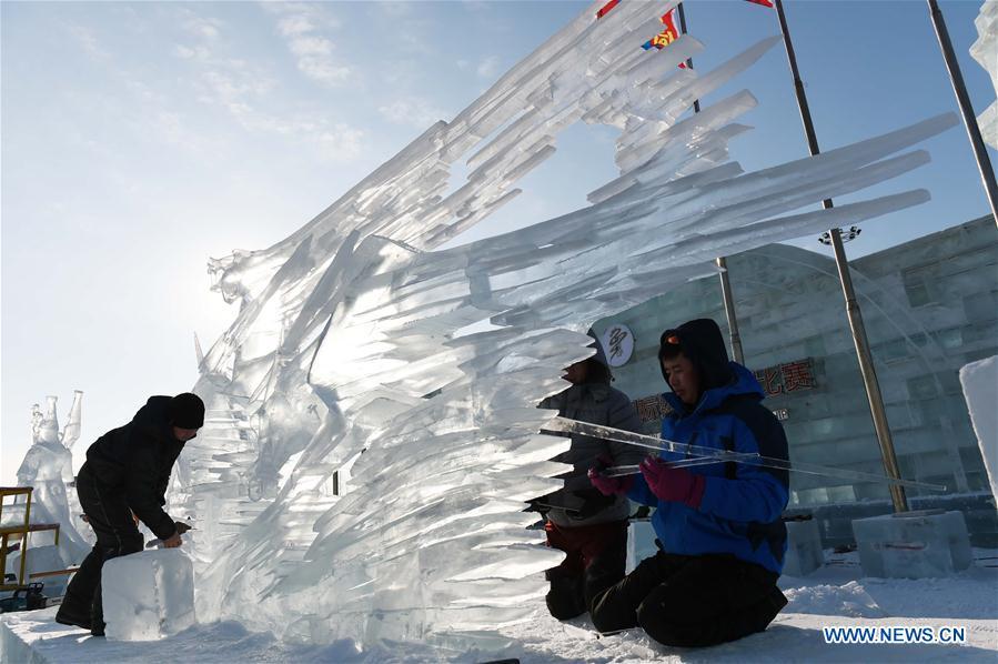 A Mongolian contestant makes ice sculpture during an international ice sculpture contest in Harbin, capital of northeast China's Heilongjiang Province, Jan. 4, 2016. (Xinhua/Wang Jianwei)