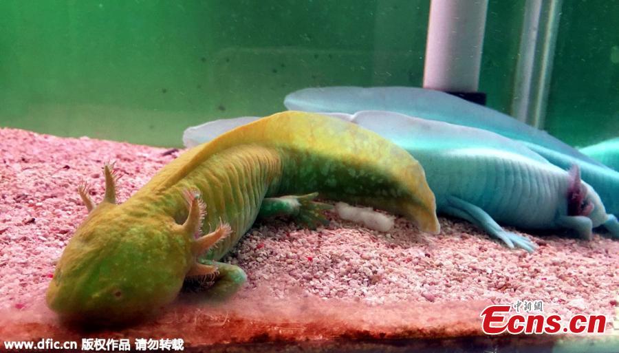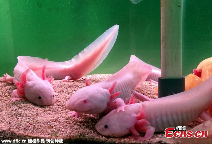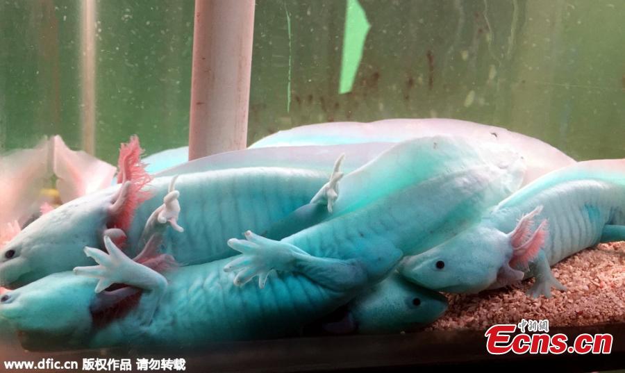 Axolotls, a type of salamander that uniquely spends its whole life in its larval form, crawls inside an aquarium in Shiyan, Central China’s Hubei Province. The pictures went viral on Internet for the species’ looks. (Photo/IC)
