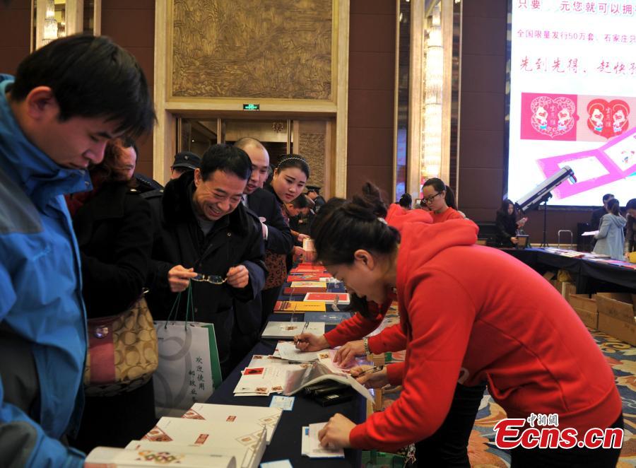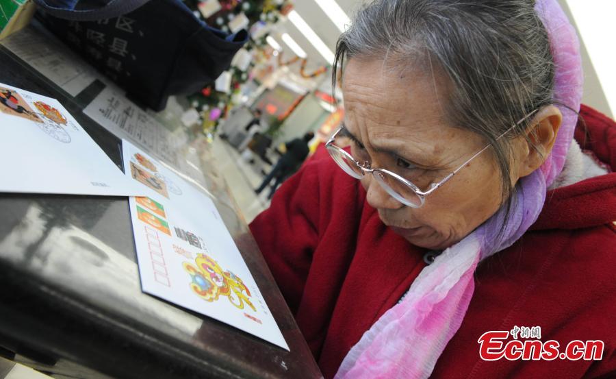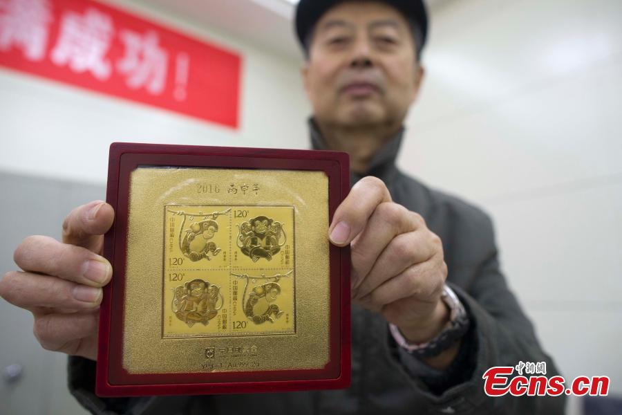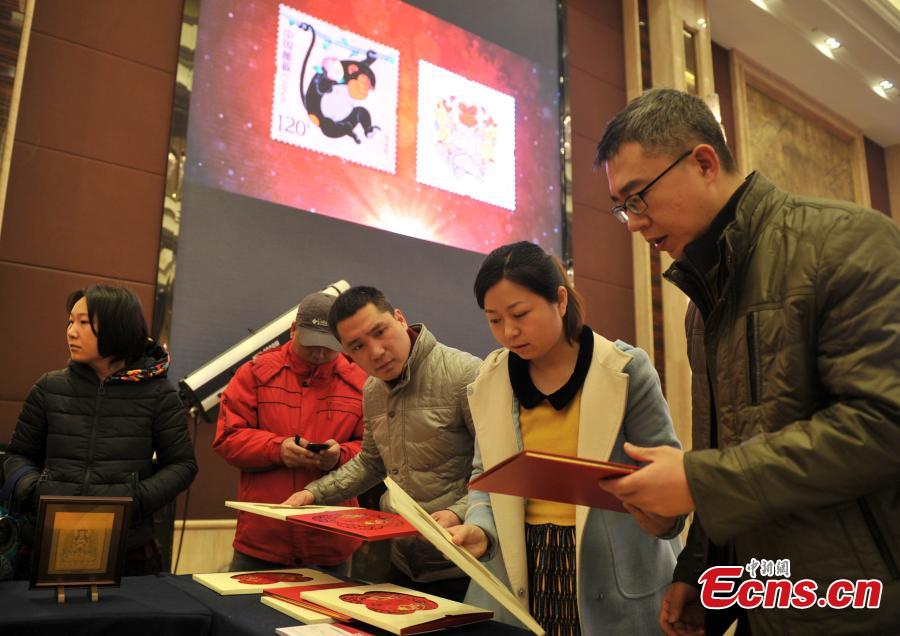 A post office worker shows stamps marking the Year of the Monkey in Shijiazhuang, North China’s Hebei Province, Jan. 5, 2016. The stamp has a face value of 1.2 yuan (about 18 U.S. cents). (Photo: China News Service/Zhai Rujia)