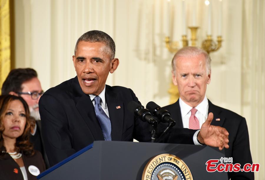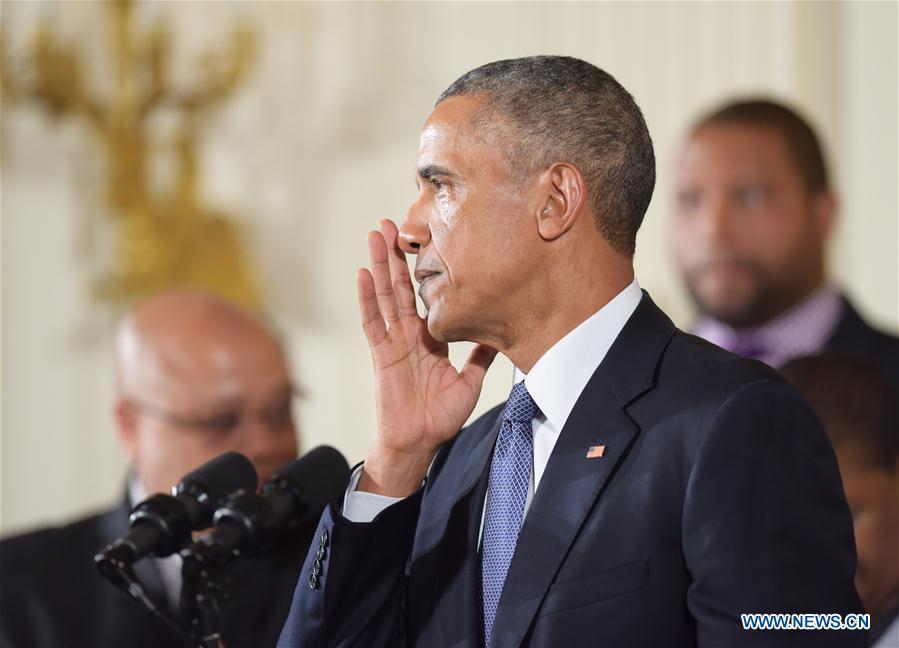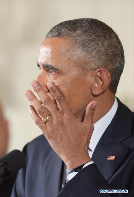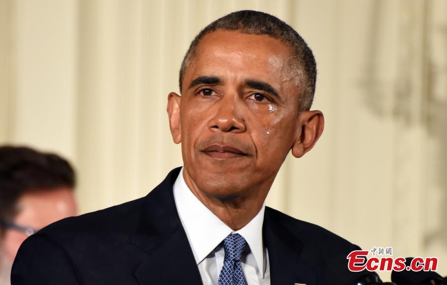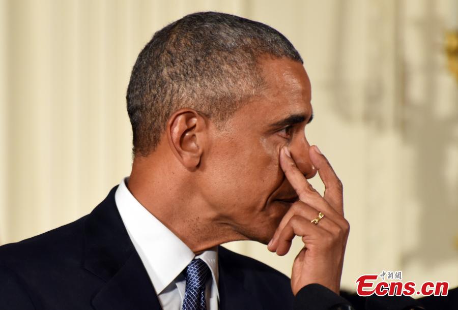 U.S. President Barack Obama wipes tears during a press conference at the White House in Washington D.C., capital of the United States, Jan. 5, 2016. Obama Tuesday unveiled a handful of executive measures on gun control, including expanding background checks, calling for "a sense of urgency" about gun violence. (Photo: China News Service/Zhang Weiran)