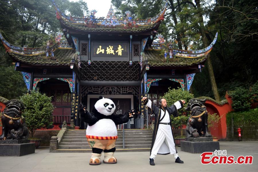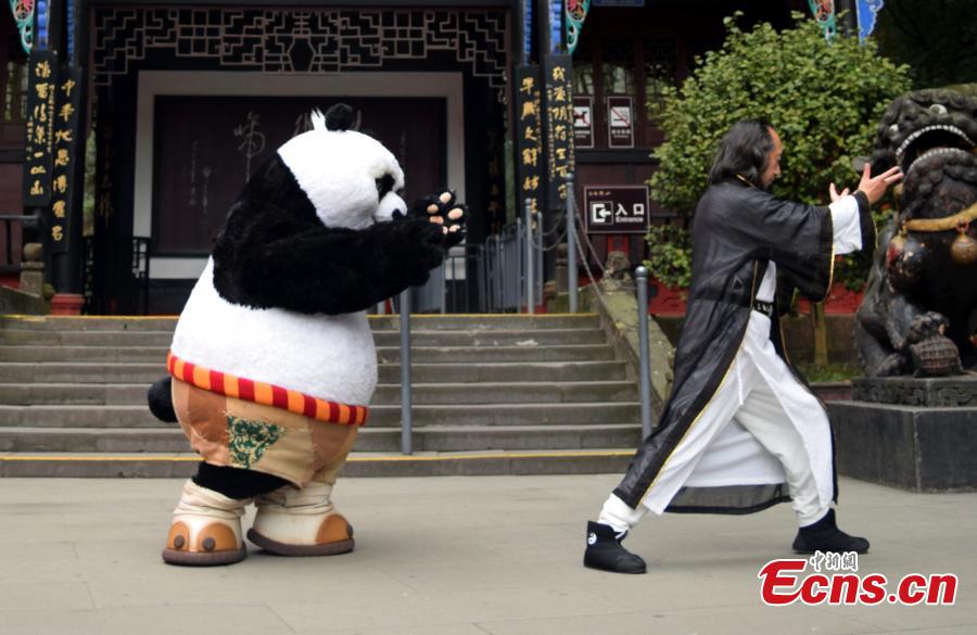 A performer dressed as Kung Fu Panda character Po learns shadowboxing with Taoist master Liu Suibin during DreamWorks' creative team's trip to Mount Qingcheng in Chengdu City, the capital of Southwest China’s Sichuan Province, Jan. 6, 2016. The mountain is featured in the third installment of Kung Fu Panda. (Photo: China News Service/Zhong Xin)