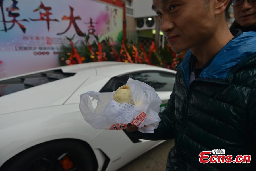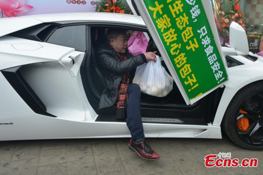 A man drives a Lamborghini car to deliver baozi (steamed stuffed bun) in Chengdu City, the capital of Southwest China’s Sichuan Province, Jan. 6, 2016. The man started a baozi restaurant after running a successful bar business for 19 years in the city. He drove his luxury car to deliver the goods to customers who ordered over 100 steamed stuffed buns at one time. He said he used the marketing stunt to ensure food quality and safety. (Photo: China News Service/Zhang Lang)