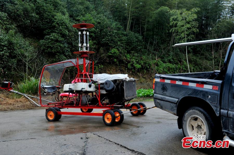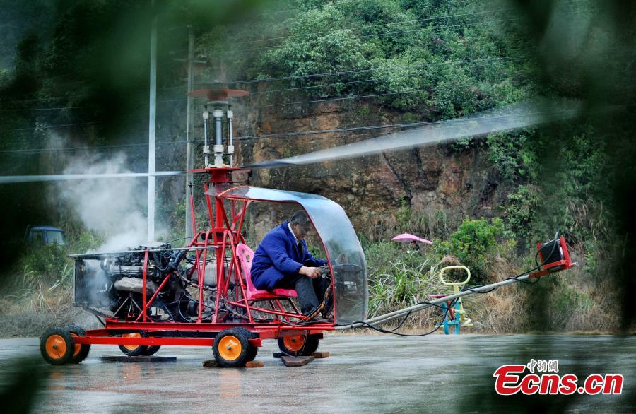 Farmer Jiang Changgen checks the helicopter he made before a test flight in Shangrao City, East China’s Jiangxi Province, Jan. 6, 2016. Jiang, who is in his 50s, spent nearly 200,000 yuan ($30,000) and took three years to create the small helicopter that is 2.65 meters high and 2.5 meters long with propellers 8 meters in diameter. It weighs 650 kilograms. The test flight failed but Jiang said he will continue improving the machine as a hobby. (Photo/IC)