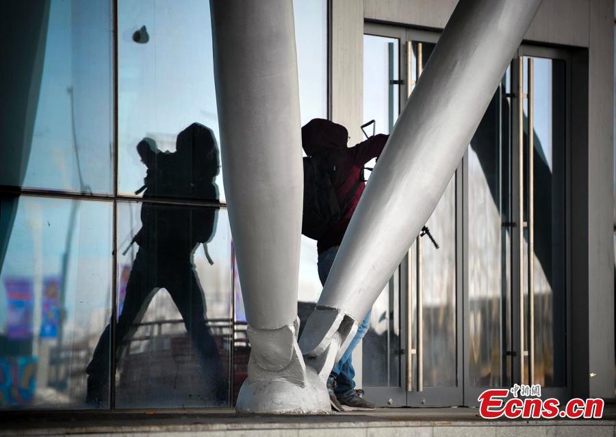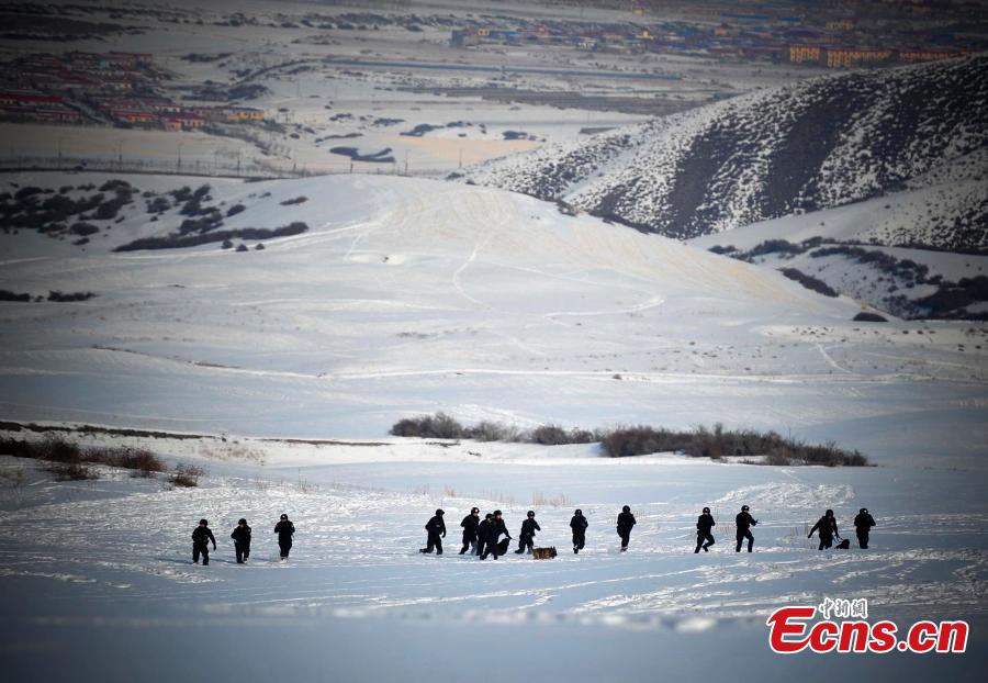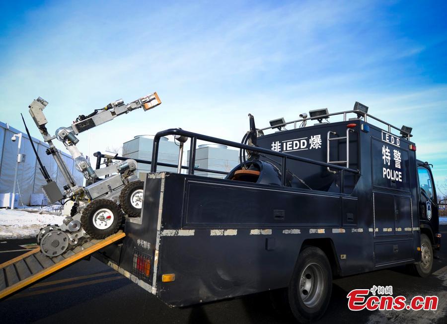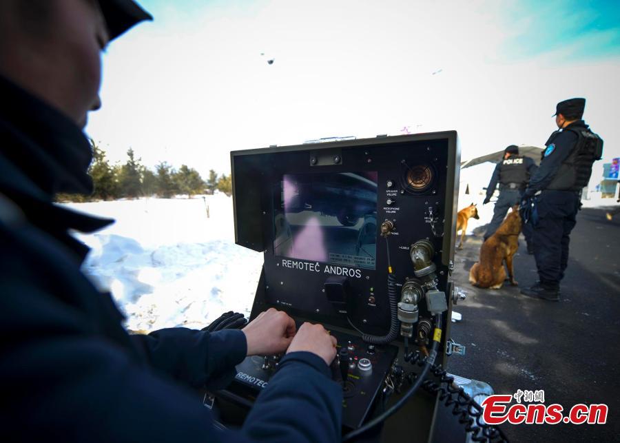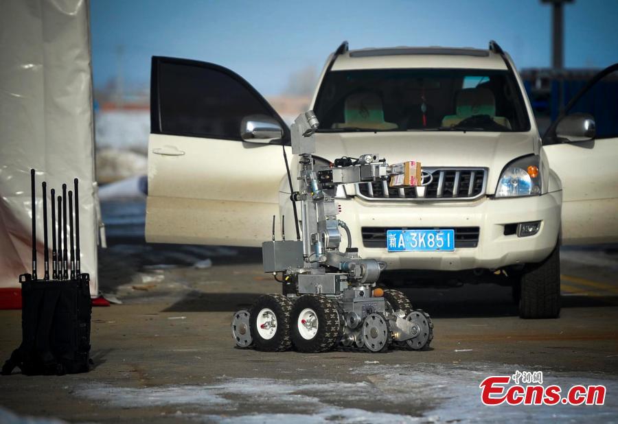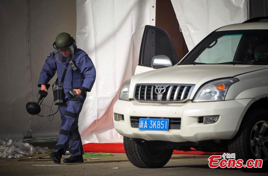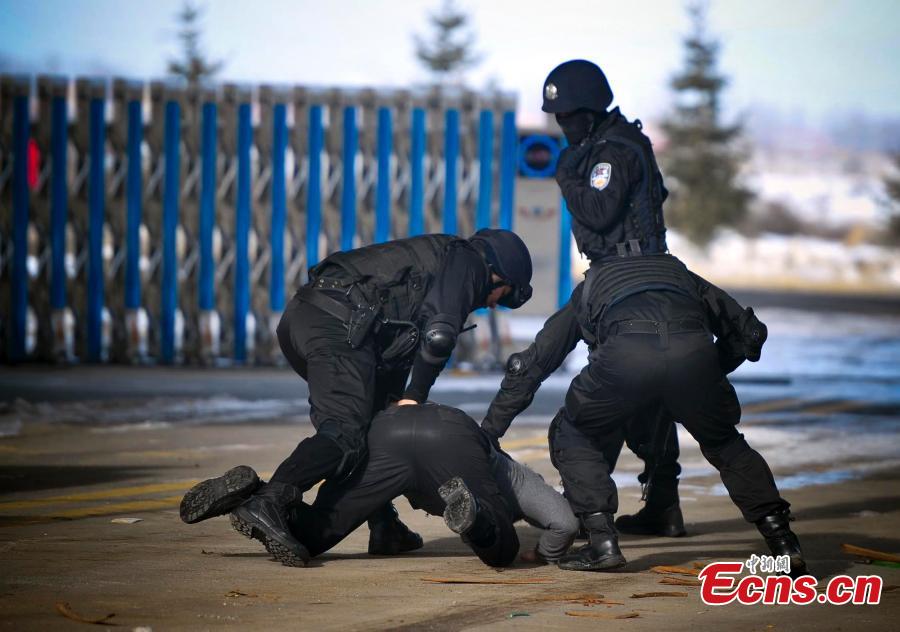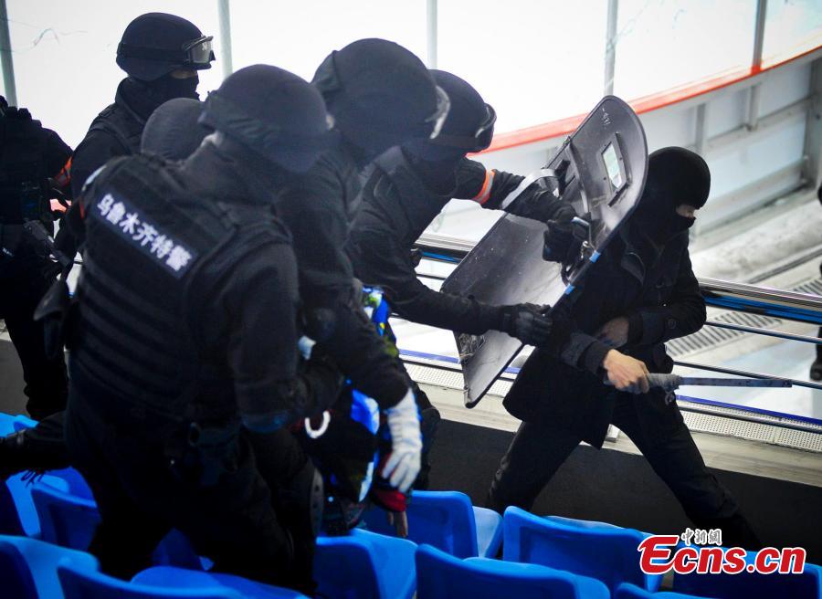 SWAT members take part in a drill at the stadiums for the 13th National Winter Games in Urumqi City, the capital of Northwest China's Xinjiang Uyghur Autonomous Region, Jan. 7, 2016. The 13th National Winter Games will be held in January. The drill aimed at bolstering emergency preparedness. (Photo: China News Service/Liu Xin)