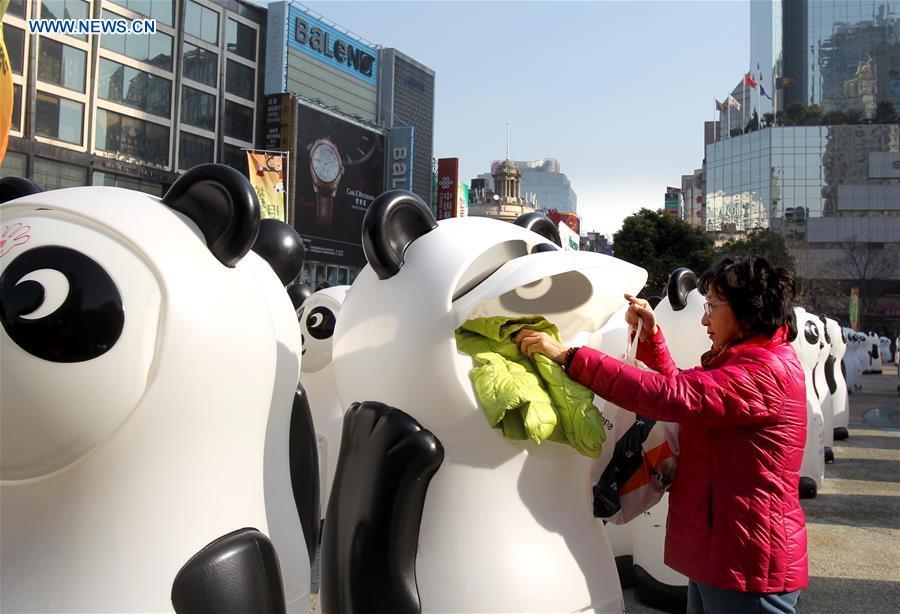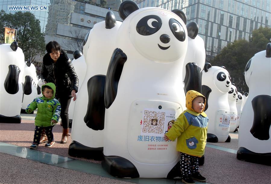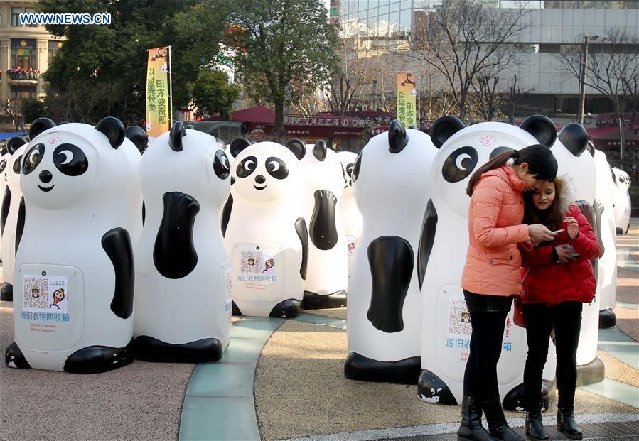 People "feed" panda-styled recycling bins with old clothes in Shanghai, east China, Jan. 8, 2016. Altogether 800 panda-styled recycling bins made appearance on Shiji Square in Nanjing Road walking street and in Huaihai Park on Friday, fed on old clothing and shoes etc. Recycled stuff in good quality will be donated after cleansing to the needed. (Photo: Xinhua/Liu Ying)
